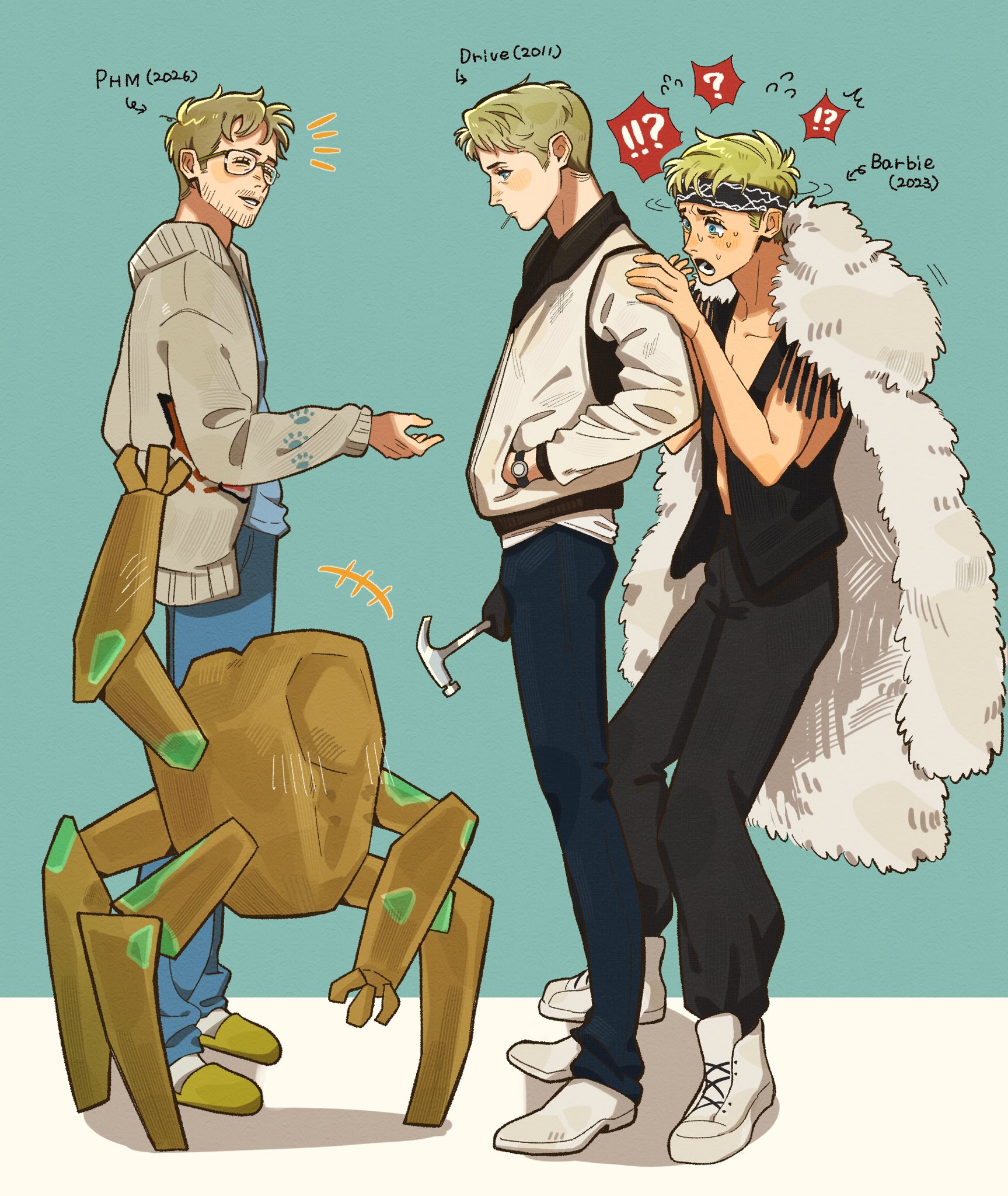 !? 3boys ? aqua_background barbie_(franchise) barbie_(live_action) beard_stubble black_headband black_pants black_vest blonde_hair blue_eyes blue_pants blue_shirt boots closed_mouth coat coat_on_shoulders commentary_request copyright_name drive_(movie) driver_(drive) facial_hair fringe_trim full_body fur_coat furrowed_brow glasses grey_jacket hammer hand_in_pocket hand_to_own_mouth headband highres holding holding_hammer jacket ken_(barbie) looking_at_another multiple_boys open_mouth pants parted_lips project_hail_mary rocky_(project_hail_mary) ryan_gosling ryland_grace sakoko_(355_saurus) shirt shoes short_hair smile standing stubble sweatdrop tearing_up toothpick vest watch white_boots white_jacket white_shirt white_shoes wristwatch