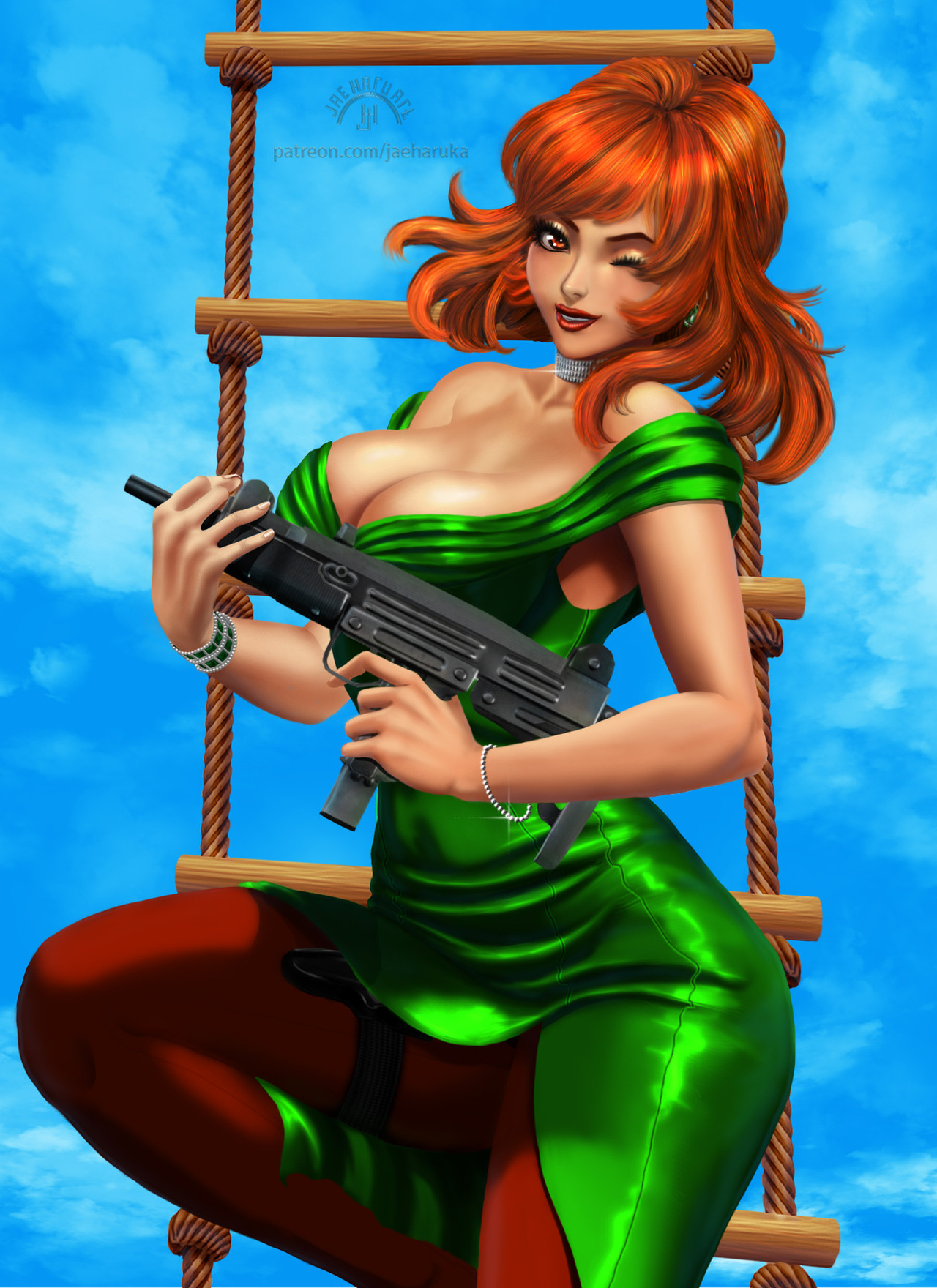1girl artist_name bare_shoulders bracelet breasts choker cloud cloudy_sky commentary day dress earrings english_commentary green_dress gun highres holding holding_gun holding_weapon jaeharuart jewelry lips lipstick looking_at_viewer lupin_iii lupin_iii:_the_first makeup medium_hair mine_fujiko official_alternate_costume on_ladder one_eye_closed orange_eyes orange_hair outdoors patreon_username realistic red_lips rope_ladder signature sky sleeveless sleeveless_dress smile solo sparkle strapless strapless_dress submachine_gun thigh_strap watermark weapon web_address