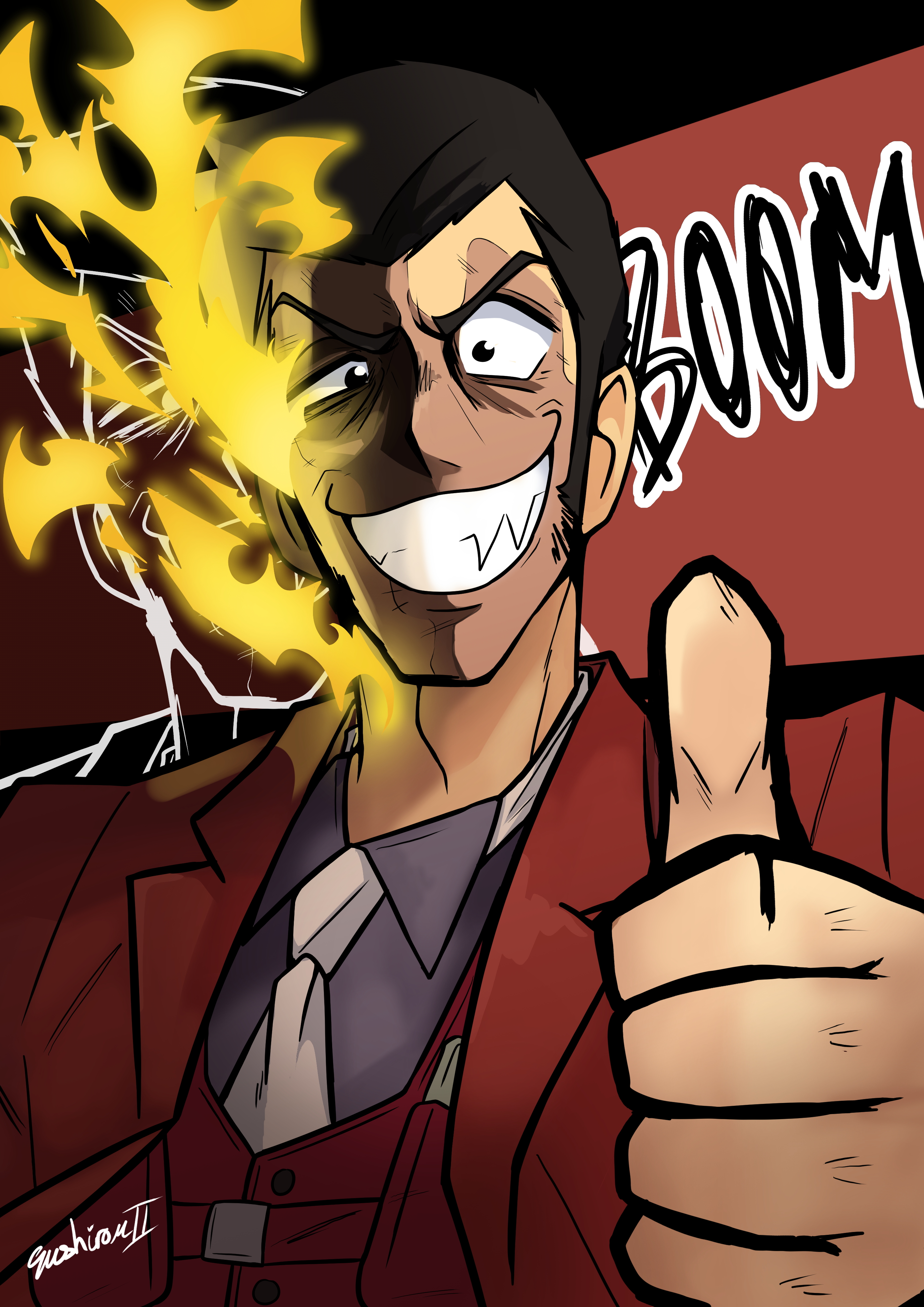 1boy absurdres black_hair burn_scar clenched_teeth commentary english_commentary evil_smile facial_hair facial_scar fake_lupin_(zenigata_to_futari_no_rupan) fire highres jacket long_sleeves looking_at_viewer lupin_iii male_focus medium_sideburns necktie open_clothes open_jacket purple_shirt red_jacket scar scar_across_eye scar_on_cheek scar_on_face scar_on_nose shirt short_hair sideburns signature smile solo sushiromii teeth white_necktie zenigata_to_futari_no_rupan