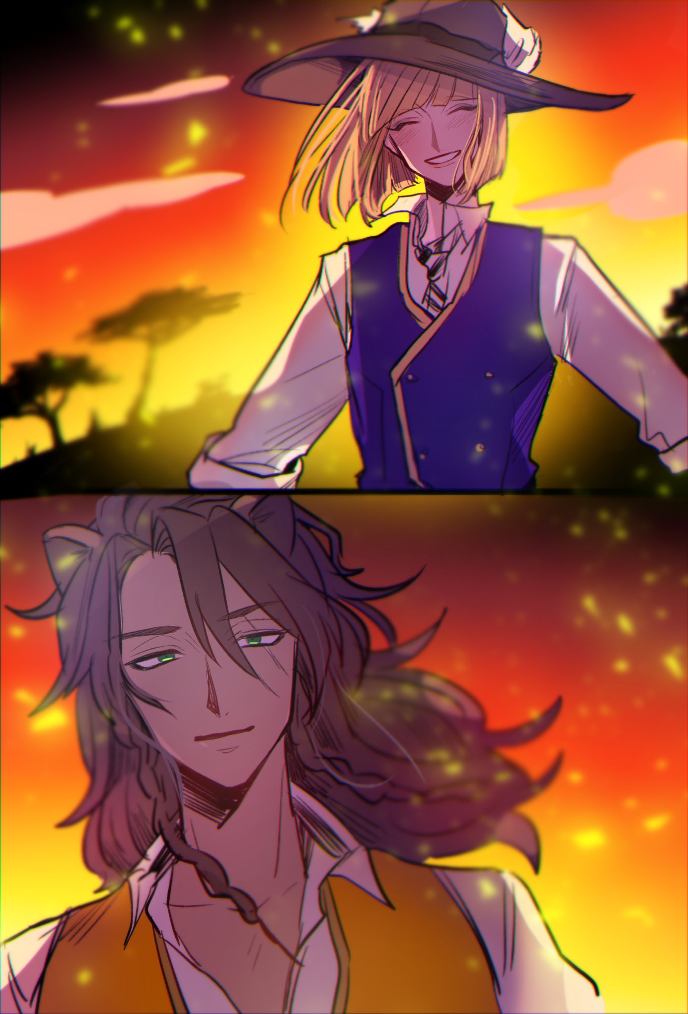 2boys animal_ears blonde_hair bob_cut braid brown_hair closed_eyes commentary_request dark-skinned_male dark_skin green_eyes hat hat_feather highres leona_kingscholar lion_boy lion_ears long_hair male_focus multiple_boys orange_sky poposeibo rook_hunt savannah scar scar_on_face school_uniform short_hair sky smile sparkle sunset tree twin_braids twisted_wonderland yaoi