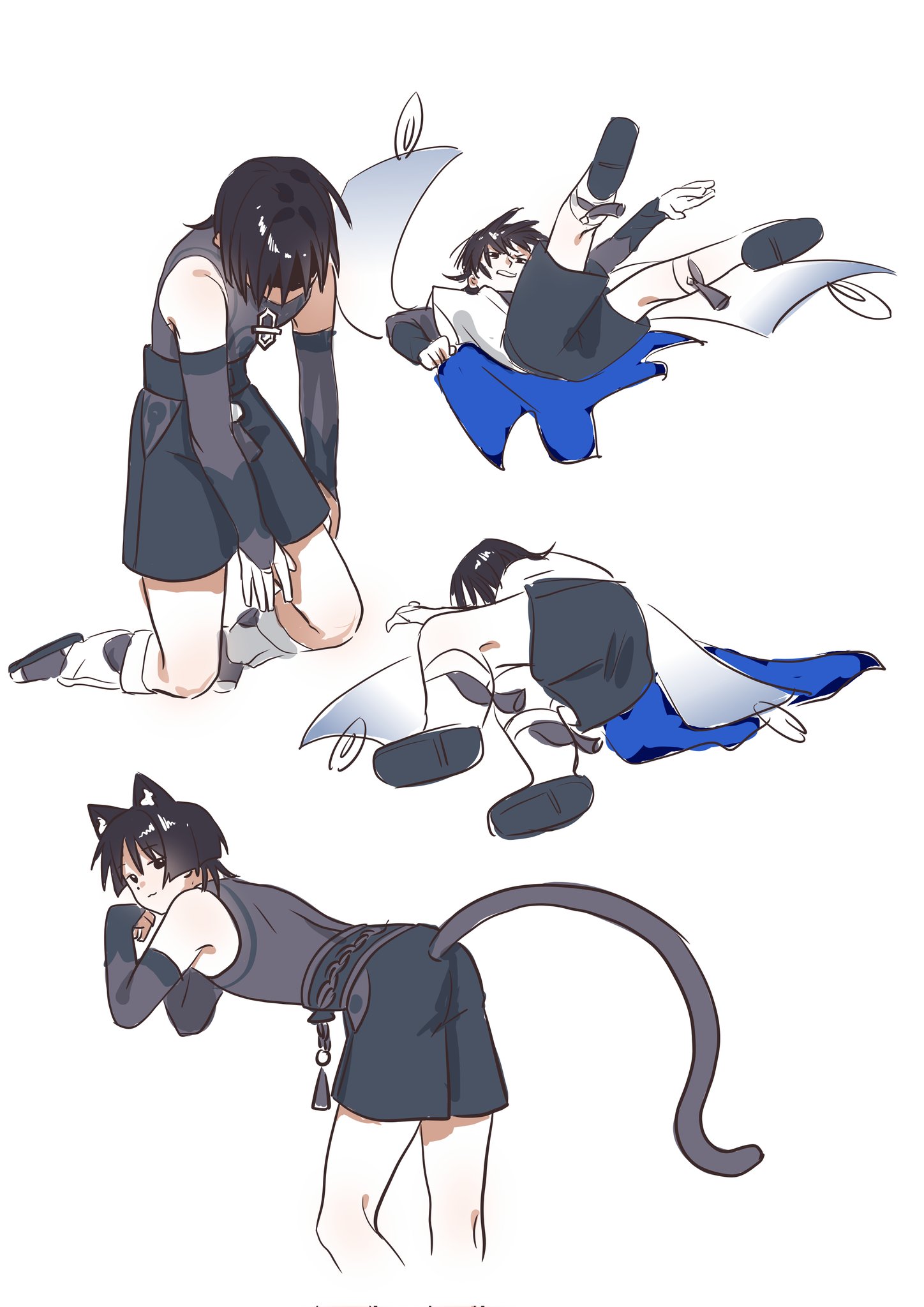 070203wjx 1boy :3 animal_ear_fluff animal_ears armor arms_at_sides belt bent_over black_belt black_bodysuit black_bridal_gauntlets black_eyes black_hair black_sandals black_shorts blue_cape blunt_ends bodysuit bridal_gauntlets cape cat_boy cat_ears cat_tail choppy_bangs clenched_hand clothing_cutout cropped_legs facing_down facing_to_the_side full_body furisode genshin_impact grey_sash highres hip_vent japanese_armor japanese_clothes kimono kneeling kote kurokote leg_warmers looking_at_viewer looking_back looking_up lying male_focus middle_ring multiple_views on_back on_side open_hand open_hands rope sandals scaramouche_(genshin_impact) shorts side_cape solo tail tassel variant_set wanderer_(genshin_impact) white_background white_kimono white_leg_warmers zouri