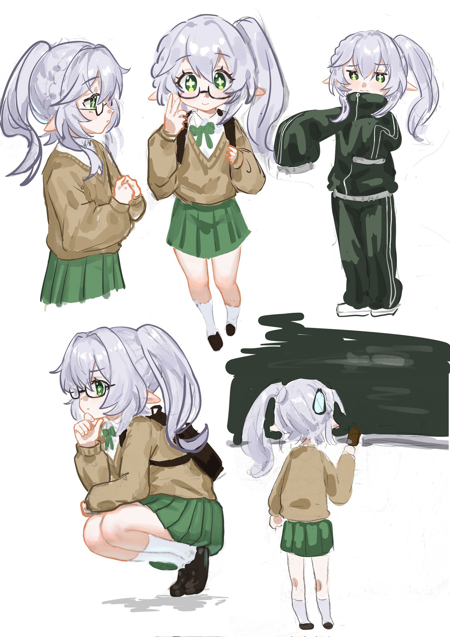 070203wjx 1girl alternate_costume arm_on_thigh asymmetrical_sidelocks backpack bag bespectacled black_bag board_eraser braid brown_sleeves brown_sweater chalkboard closed_mouth commentary contemporary cross-shaped_pupils eyelashes fingernails full-length_zipper full_body genshin_impact glasses green_eyes green_jacket green_pants green_skirt green_sleeves hair_between_eyes half_crown_braid hand_on_own_chin hands_up highres holding_board_eraser jacket long_hair long_sleeves looking_at_viewer looking_to_the_side medium_skirt multiple_views nahida_(genshin_impact) own_hands_together pants pleated_skirt pointy_ears school_uniform semi-rimless_eyewear shoes side_ponytail sidelocks skirt sleeves_past_fingers sleeves_past_wrists solo squatting sweatdrop sweater symbol-shaped_pupils tareme thinking track_jacket track_pants turtleneck turtleneck_jacket untranslatable_commentary white_background white_hair white_shoes white_trim yellow_pupils zipper