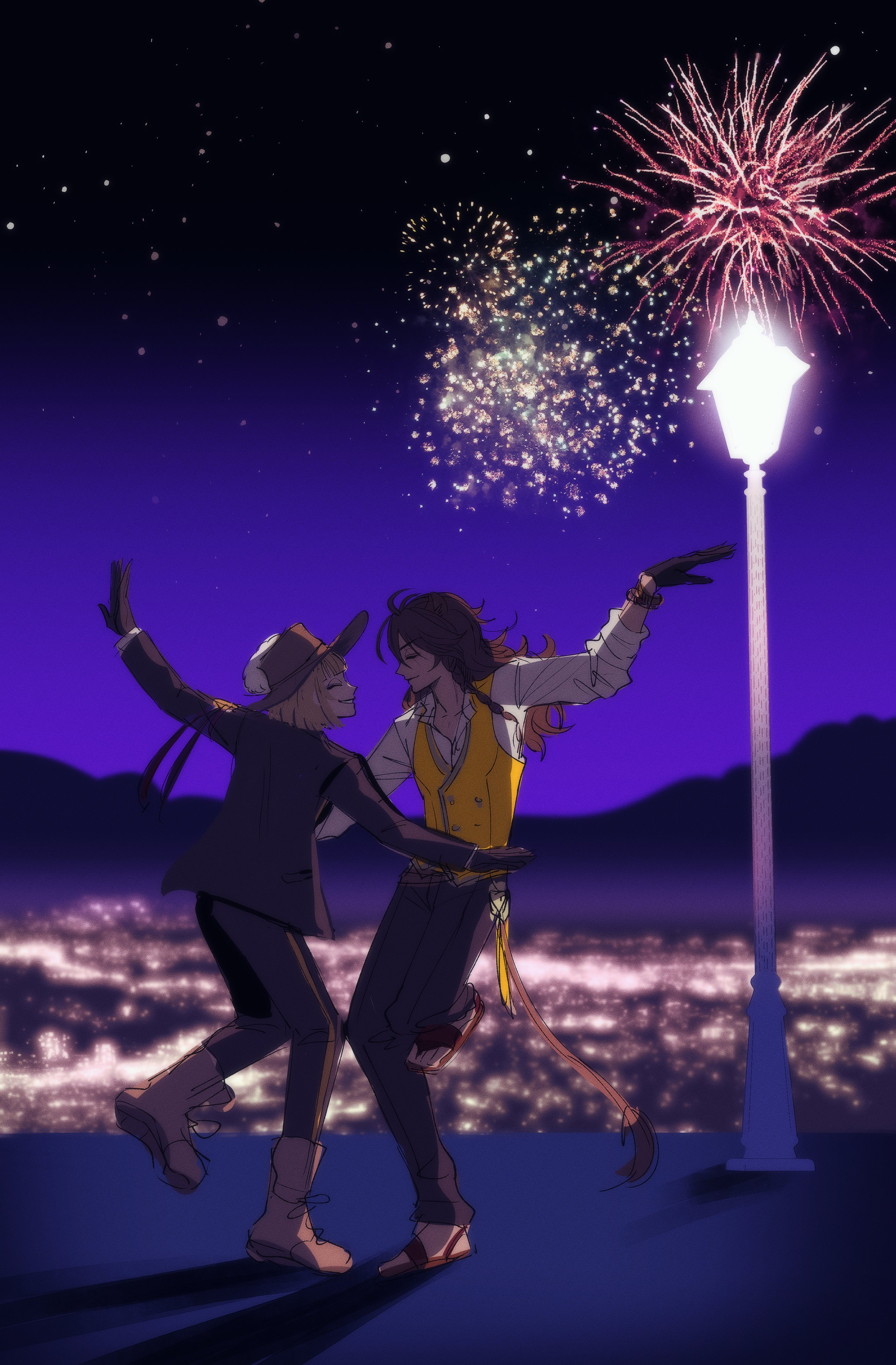 2boys absurdres animal_ears blonde_hair bob_cut boots braid brown_boots brown_hair closed_eyes colored_skin commentary_request dancing dark-skinned_male dark_skin fireworks hat hat_feather highres la_la_land lamppost leona_kingscholar lion_boy lion_ears lion_tail long_hair male_focus mountainous_horizon multiple_boys parody poposeibo red_sandals rook_hunt sandals scar scar_on_face school_uniform short_hair sky smile standing standing_on_one_leg star_(sky) starry_sky tail twin_braids twisted_wonderland white_skin yaoi
