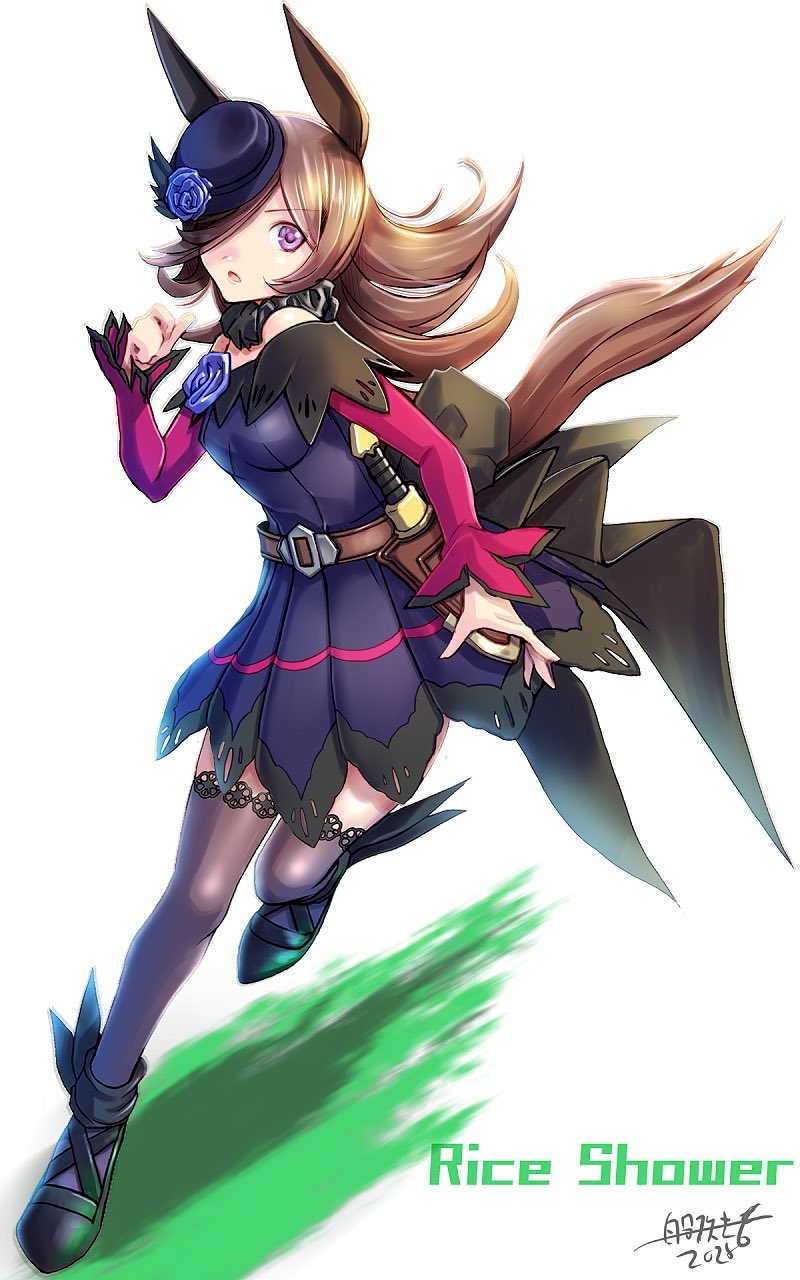 1girl animal_ears bare_shoulders black_thighhighs blue_dress blue_flower blue_hat blue_rose blush breasts brown_hair character_name commentary_request dagger dress flipped_hair flower funaya_sakichi fur_choker hair_over_one_eye hat hat_flower highres horse_ears horse_girl horse_tail knife long_hair long_sleeves looking_at_viewer medium_breasts off-shoulder_dress off_shoulder open_mouth purple_eyes rice_shower_(rosy_dreams)_(umamusume) rice_shower_(umamusume) rose running sheath sheathed shoes solo tail thighhighs tilted_headwear umamusume weapon