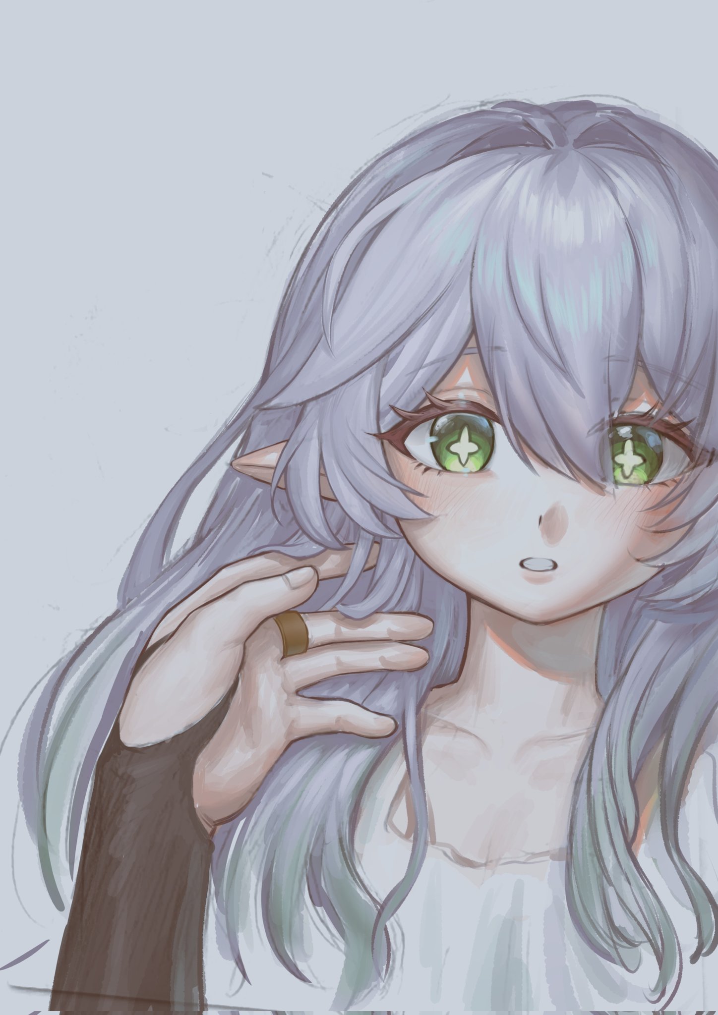 070203wjx 1girl alternate_hairstyle black_bridal_gauntlets blush bridal_gauntlets bright_pupils clenched_teeth collarbone colored_tips cross-shaped_pupils dress fingernails genshin_impact gold_ring green_eyes green_hair hair_between_eyes hair_down hair_intakes hand_in_another's_hair highres long_hair looking_at_viewer middle_ring multicolored_hair nahida_(genshin_impact) pointy_ears portrait pov pov_hands scaramouche_(genshin_impact) symbol-shaped_pupils teeth wanderer_(genshin_impact) white_background white_dress white_hair white_pupils