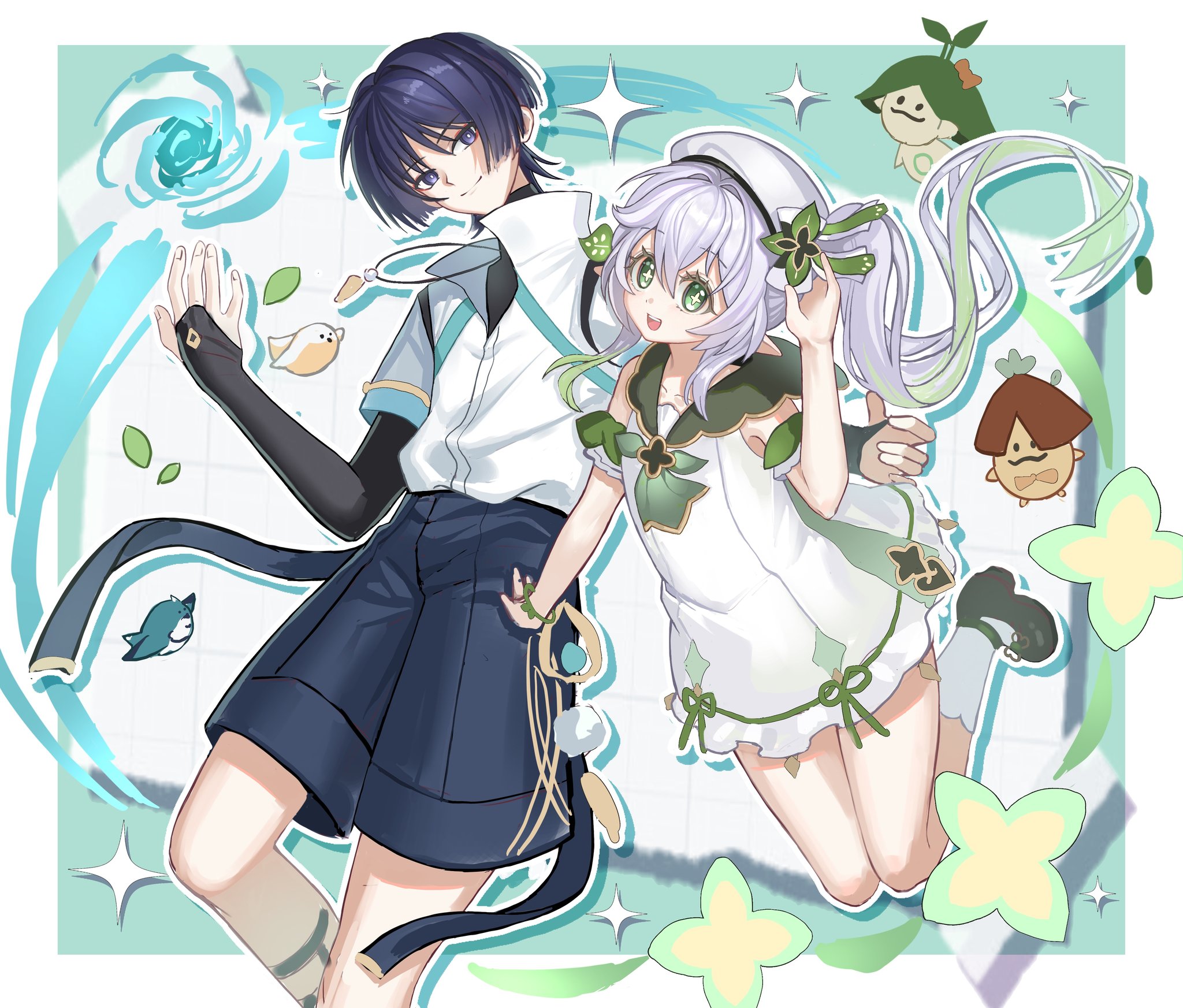 070203wjx 1boy 1girl aqua_trim aranara_(genshin_impact) arm_at_side ascot bird black_bridal_gauntlets black_hair black_shirt black_shorts blue_gem blunt_ends border bow bracelet bridal_gauntlets bright_pupils casual closed_mouth collarbone collared_shirt colored_eyelashes contemporary creature cross-shaped_pupils curled_fingers detached_sleeves dress eyeliner falling_leaves feather_necklace feathers finch fingernails gem genshin_impact gold_trim green_ascot green_eyes green_hair green_sailor_collar green_shoes green_trim grid_background hair_between_eyes hair_intakes hair_ornament hand_up hat hat_bow highres jewelry layered_shirt leaf leaf_hair_ornament legs_together long_hair looking_at_viewer makeup mary_janes multicolored_hair nahida_(genshin_impact) necklace official_alternate_costume open_hand open_mouth outline partially_unbuttoned pendant pointy_ears pom_pom_(clothes) popped_collar purple_eyes red_eyeliner sailor_collar sailor_hat scaramouche_(genshin_impact) shirt shoes short_dress short_sleeves shorts side_ponytail sidelocks smile socks sparkle split_mouth streaked_hair symbol-shaped_pupils tareme teeth tsurime undershirt upper_teeth_only variant_set vision_(genshin_impact) vortex wanderer_(genshin_impact) white_background white_border white_bow white_dress white_hair white_outline white_pupils white_shirt white_sleeves white_socks wind wispy_bangs yellow_feathers yellow_pupils