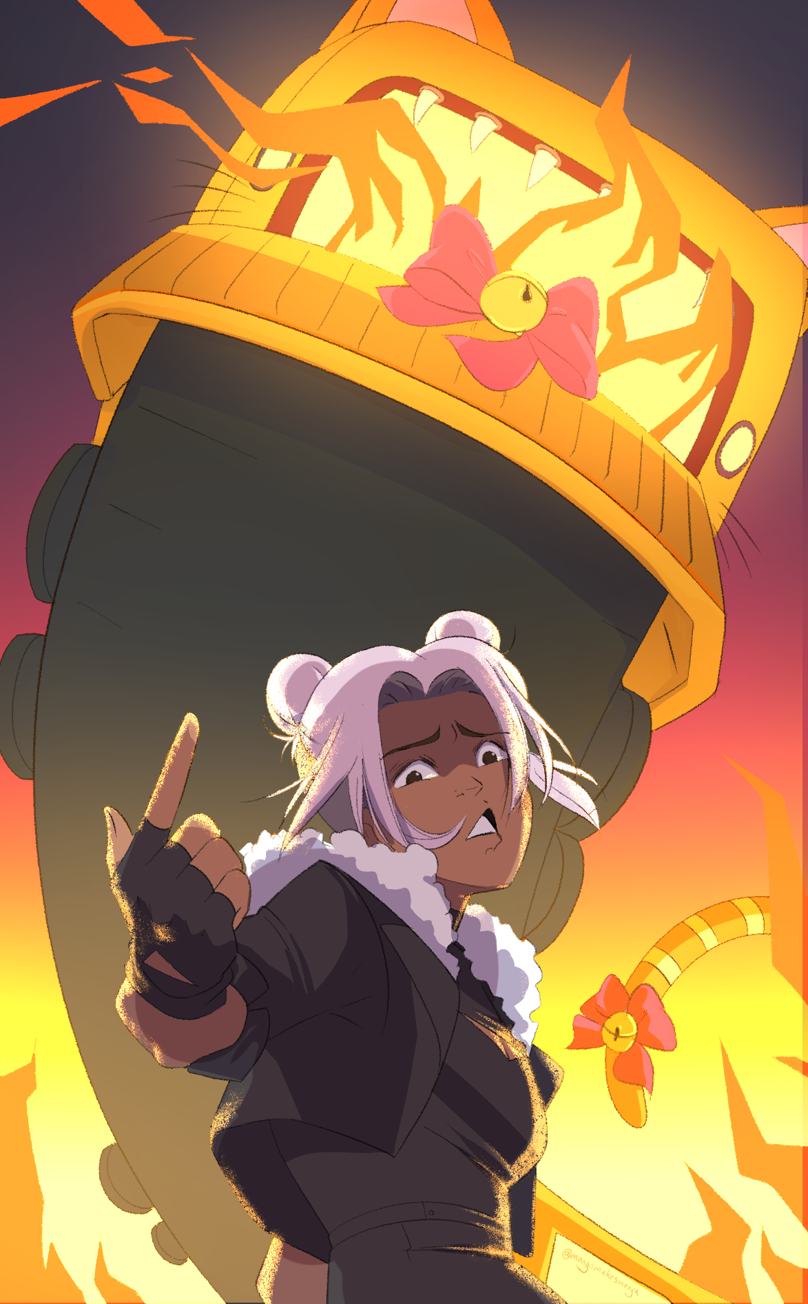 1girl bell bow breasts cat cleavage commentary dark-skinned_female dark_skin double_bun drawfee drawtectives english_commentary fingerless_gloves fire gloves hair_bun hairline highres jacket jingle_bell lobster_bisque_(drawtectives) official_alternate_costume official_alternate_hairstyle one-true-mango pink_hair pointing rose_(drawtectives) sharp_teeth teeth train undercut upper_body whiskers