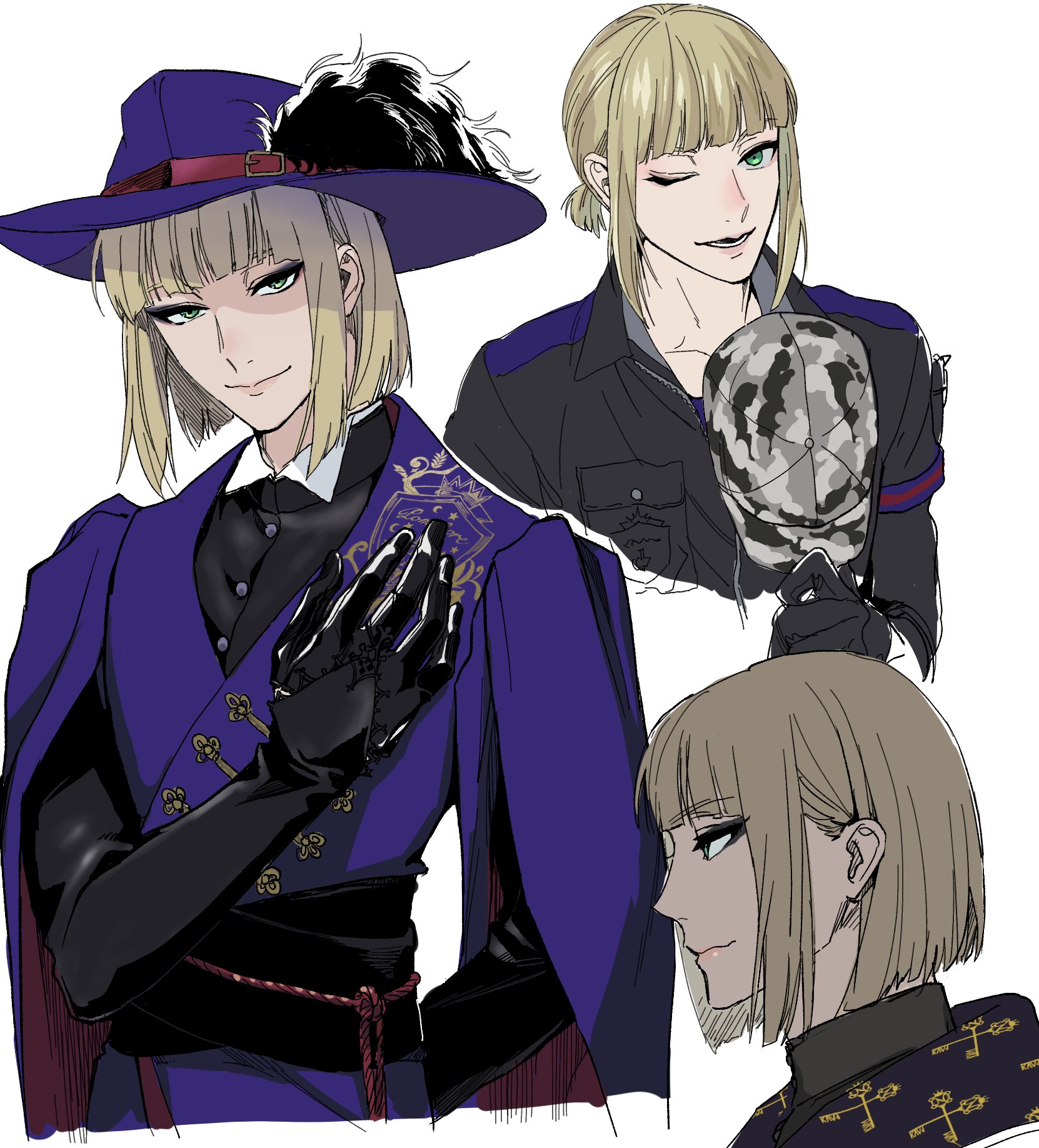 1boy black_gloves black_robe blonde_hair bob_cut camouflage_hat colored_skin commentary gloves green_eyes hat hat_feather highres long_sleeves male_focus pomefiore_dorm_uniform ponytail purple_robe robe rook_hunt short_hair tw_komat twisted_wonderland untranslatable_commentary white_skin