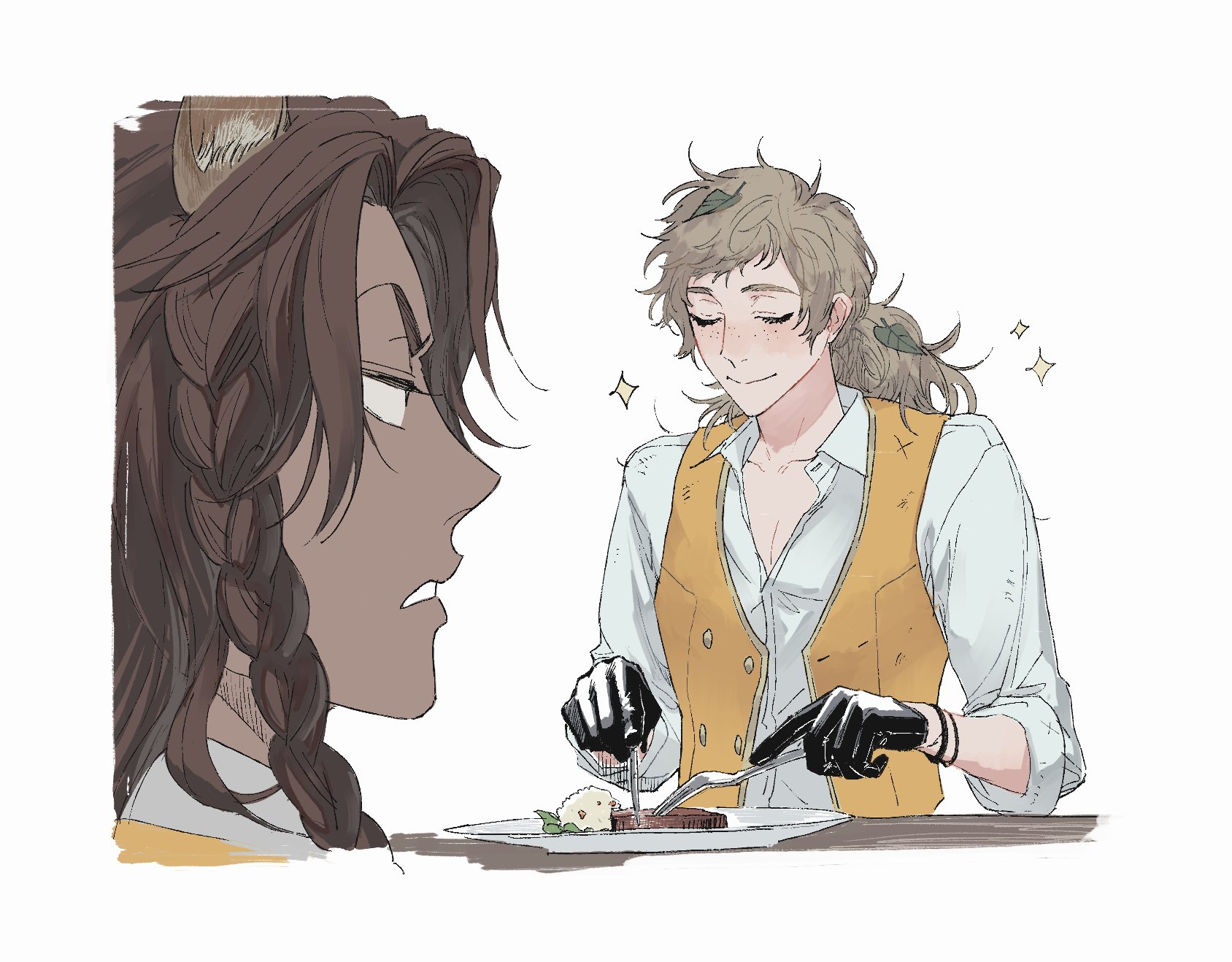 2boys black_jacket blonde_hair body_freckles braid branch_in_mouth breasts cleavage closed_eyes colored_skin dark-skinned_male dark_skin dirty food fork freckles hair_branch hair_bun hat hat_feather highres holding holding_fork holding_knife jacket knife leaf leaf_on_head leona_kingscholar long_hair looking_at_another male_focus meat messy_hair multiple_boys muscular muscular_male ponytail purple_robe robe rook_hunt scar shining smile tw_komat twisted_wonderland white_background white_skin