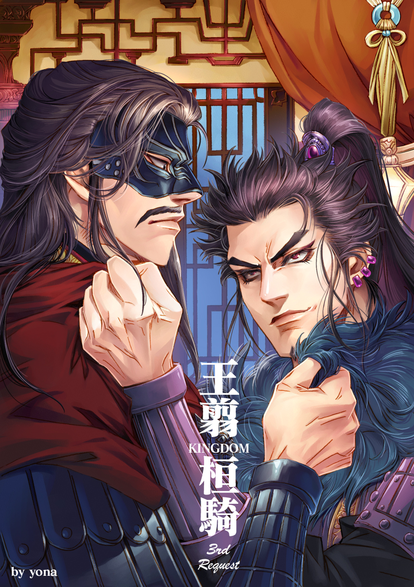 2boys black_hair brown_eyes closed_mouth clothes_grab commentary_request copyright_name earrings eyelashes facial_hair furrowed_brow highres jewelry kanki_(kingdom) kingdom_(series) male_focus mask multiple_boys mustache ousen_(kingdom) ponytail tassel translation_request v-shaped_eyebrows yona_(edenkasuga)