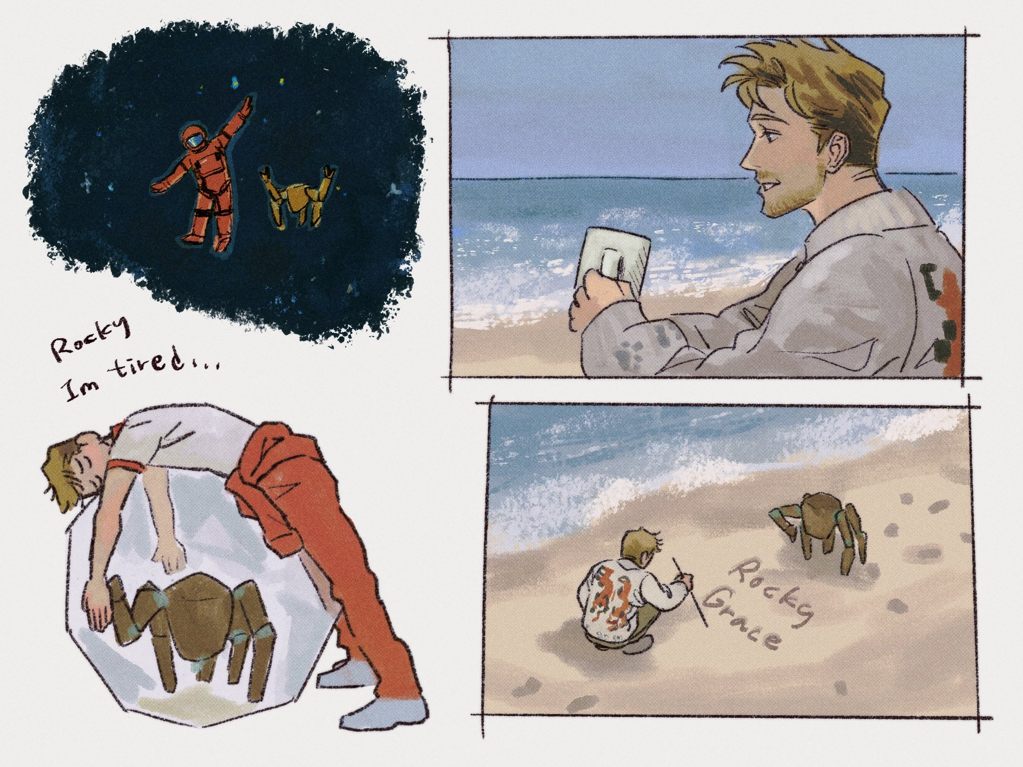 021062 1boy alien beach beard beard_stubble casual commentary facial_hair highres messy_hair project_hail_mary rocky_(project_hail_mary) ryland_grace spacesuit stubble
