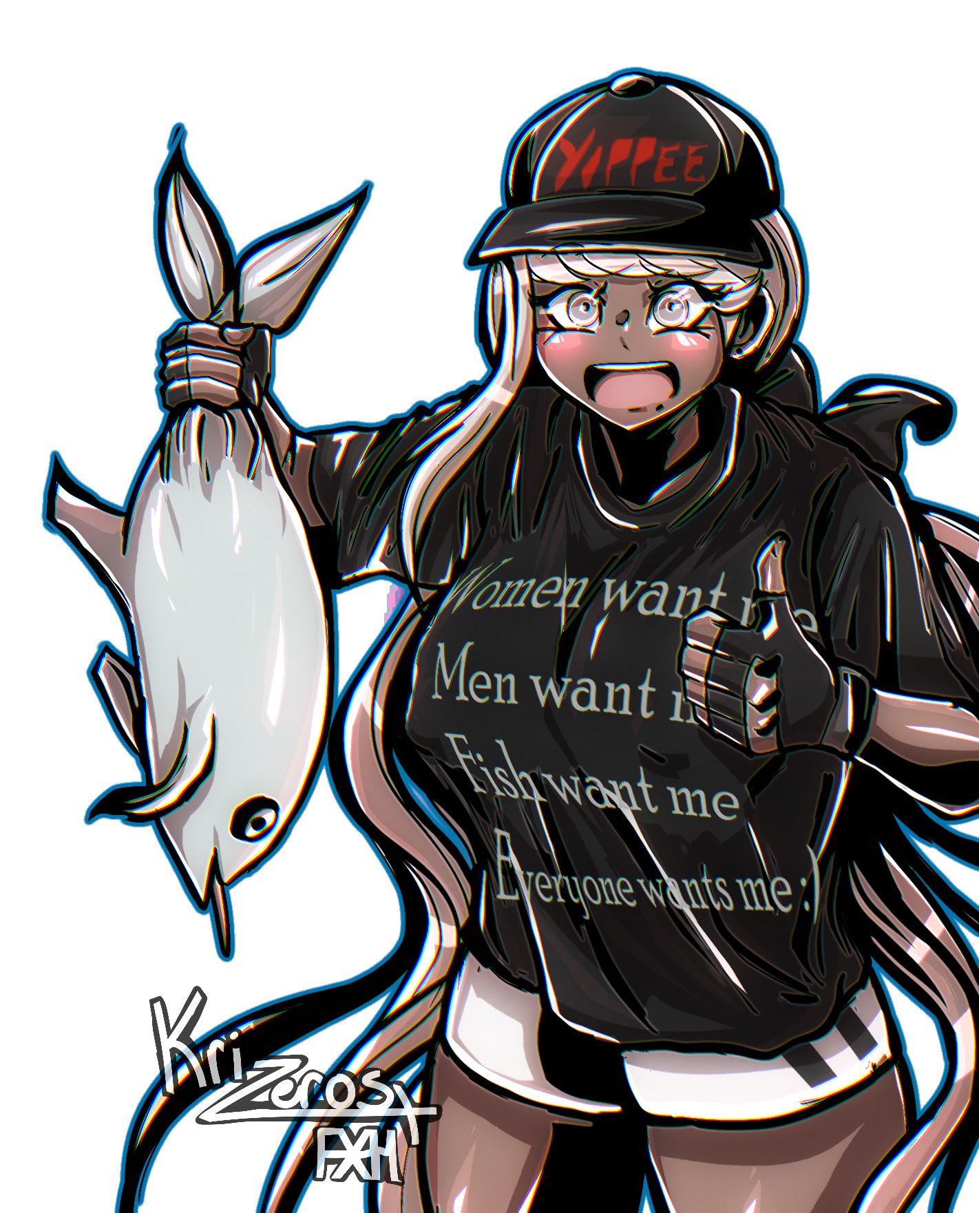 1girl artist_name blonde_hair dark-skinned_female dark_skin english_text female_focus fingerless_gloves fish gloves kawana_tsubasa krizeros long_hair looking_at_viewer open_mouth signature simple_background solo solo_focus teeth the_hundred_line_-last_defense_academy- tongue upper_teeth_only white_background