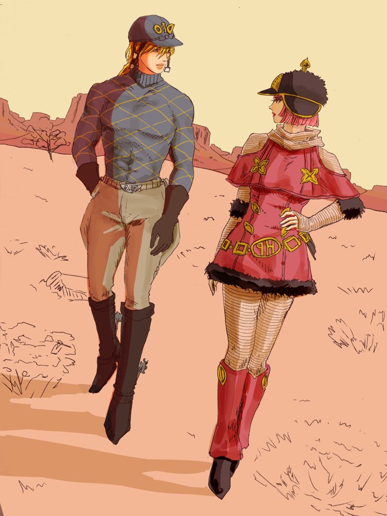 1boy 1girl argyle_clothes argyle_sweater blonde_hair capelet desert diego_brando grills hot_pants_(sbr) jojo_no_kimyou_na_bouken looking_at_another pink_capelet pink_hair rose_bae steel_ball_run sweater