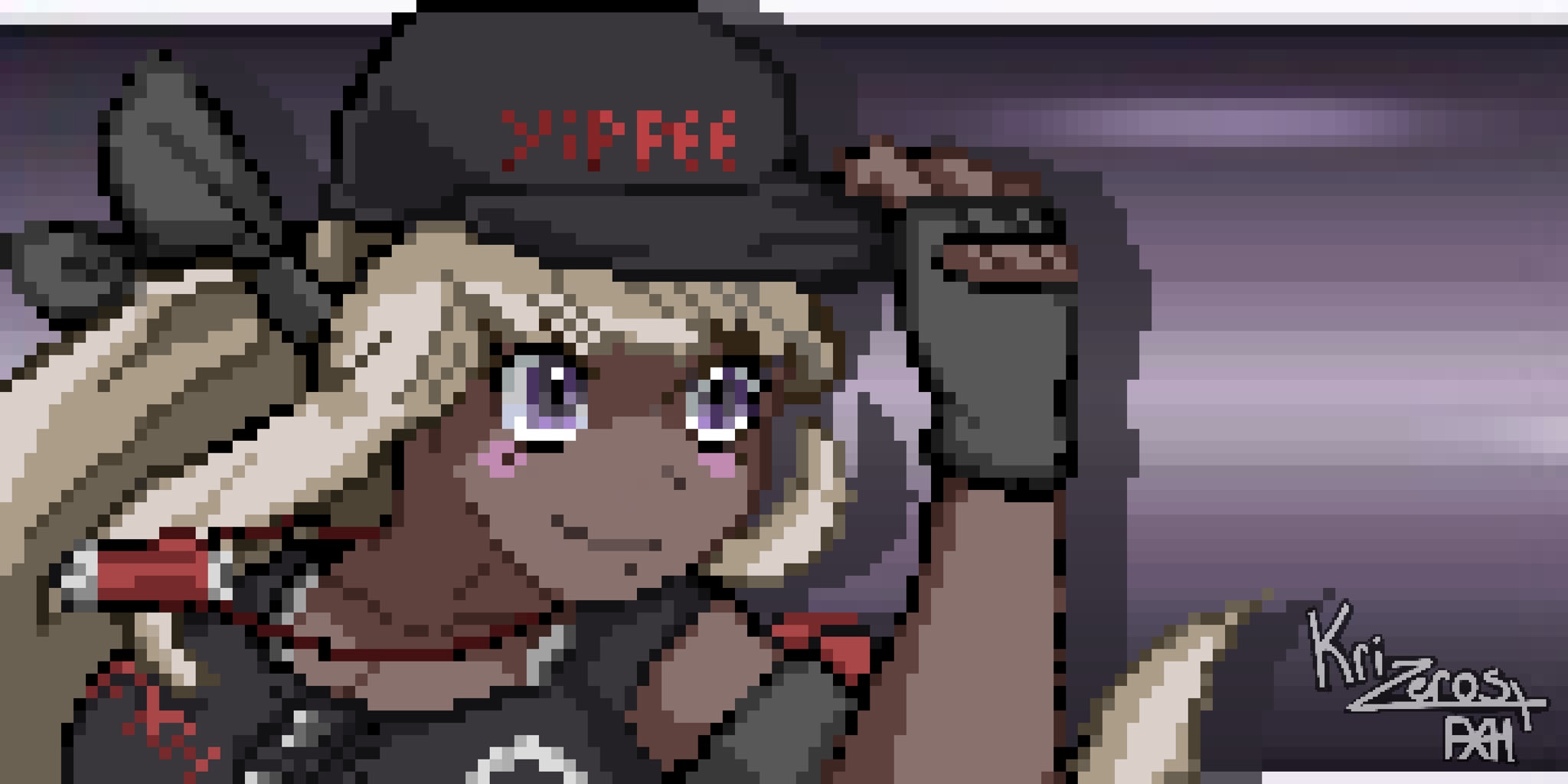 1girl artist_name baseball_cap blonde_hair collarbone dark-skinned_female dark_skin female_focus fingerless_gloves gloves gradient_background hand_up hat kawana_tsubasa krizeros parody ponytail purple_background purple_eyes signature solo solo_focus style_parody the_hundred_line_-last_defense_academy- upper_body