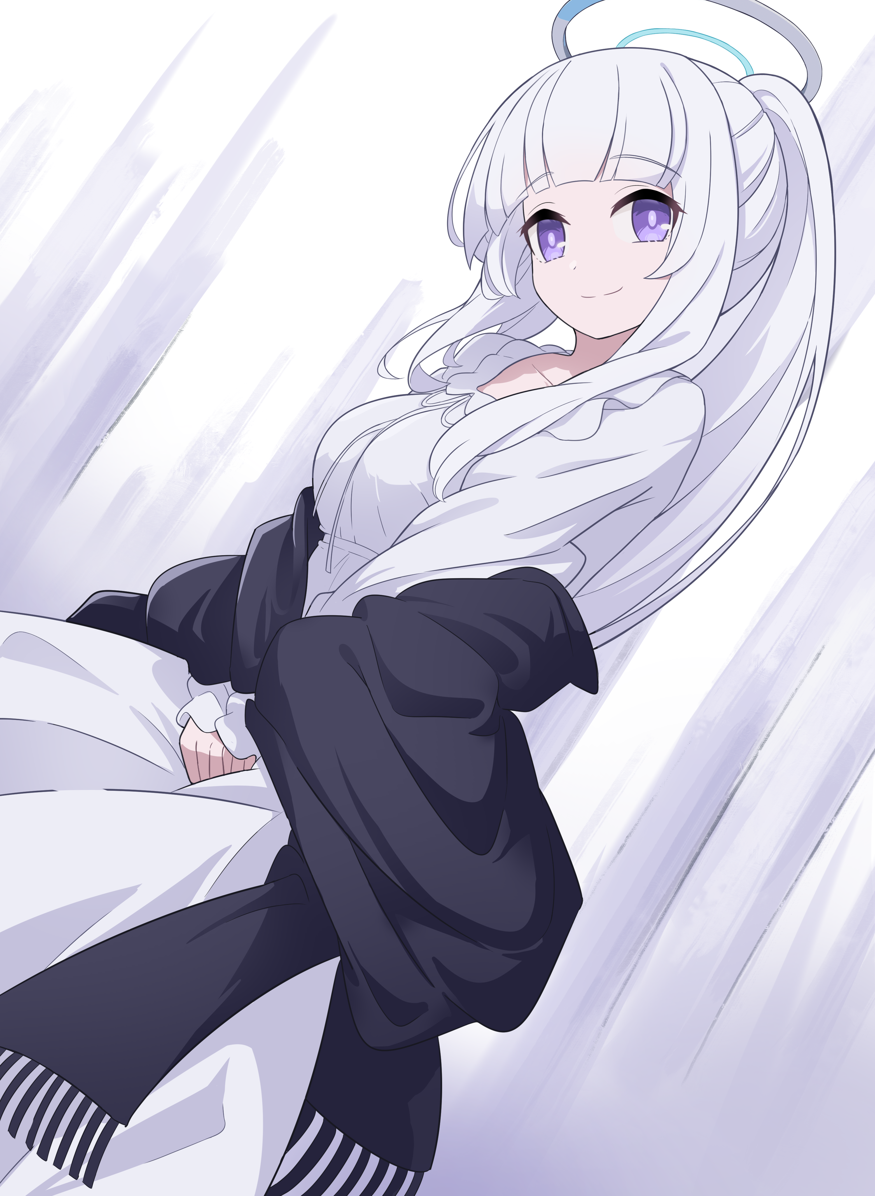 1girl absurdres black_shawl blue_archive blush breasts closed_mouth collarbone commentary_request halo high_ponytail highres kittenlochen large_breasts long_hair long_sleeves looking_at_viewer noa_(blue_archive) noa_(pajamas)_(blue_archive) official_alternate_costume pajamas ponytail purple_eyes shawl smile solo upper_body very_long_hair white_hair white_pajamas
