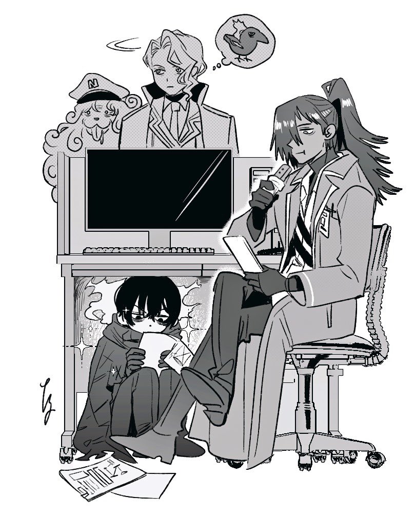 1girl 2boys ahab_(project_moon) animalization aseah_(project_moon) chair closed_mouth coat commentary_request computer_keyboard crossed_legs curly_hair e.g.o_(project_moon) fell_bullet_(e.g.o) fire greyscale hair_over_one_eye half_updo hat hermann_(project_moon) knees_up lapels limbus_company long_hair military_hat military_uniform monitor monochrome multiple_boys n_corp._e.g.o_(identity)_(project_moon) necktie notched_lapels office_chair pants project_moon shoes short_hair sitting sparkling_eyes swivel_chair tama_launcher undershirt very_long_hair yi_sang_(project_moon)