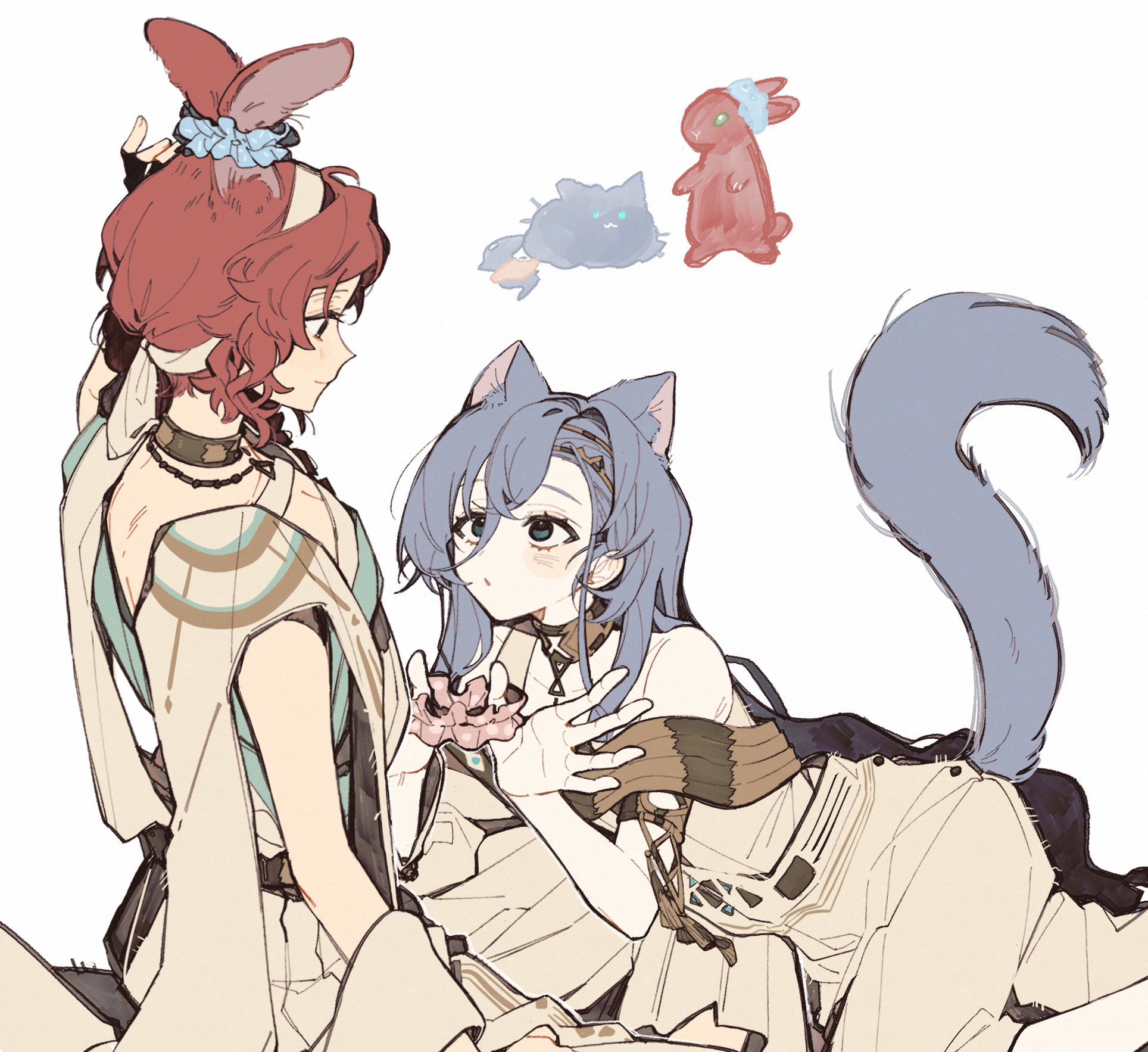 2girls 37_(reverse:1999) ancient_greek_clothes animal_ears animalization blue_cat blue_eyes blue_hair blue_scrunchie cat cat_ears cat_girl cat_tail gold_choker greco-roman_clothes hair_between_eyes hand_up hands_up highres holding_scrunchie kemonomimi_mode kneeling long_hair looking_at_another multiple_girls person_and_animalization pink_scrunchie profile rabbit rabbit_ears rabbit_girl red_hair reverse:1999 scrunchie smile sophia_(reverse:1999) tail tied_ears white_background wo_shi_nugui yuri