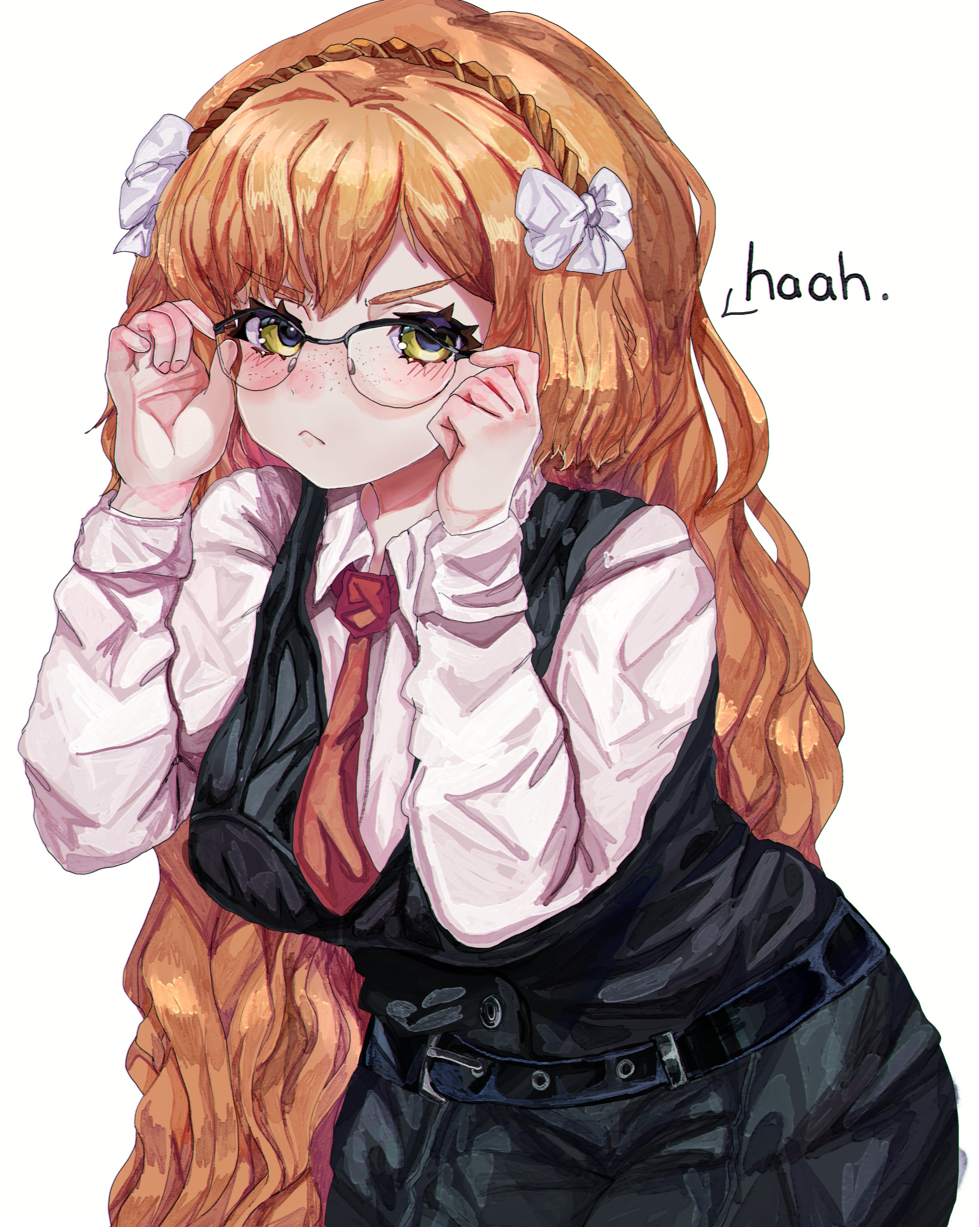 1girl absurdres bespectacled black_pants black_vest bow brown_hairband cowboy_shot glasses green_eyes hair_bow hairband hands_up heathcliffpyon highres ishmael_(project_moon) limbus_company long_hair long_sleeves looking_at_viewer orange_hair pants project_moon rope shirt sidelocks simple_background solo very_long_hair vest white_background white_bow white_shirt