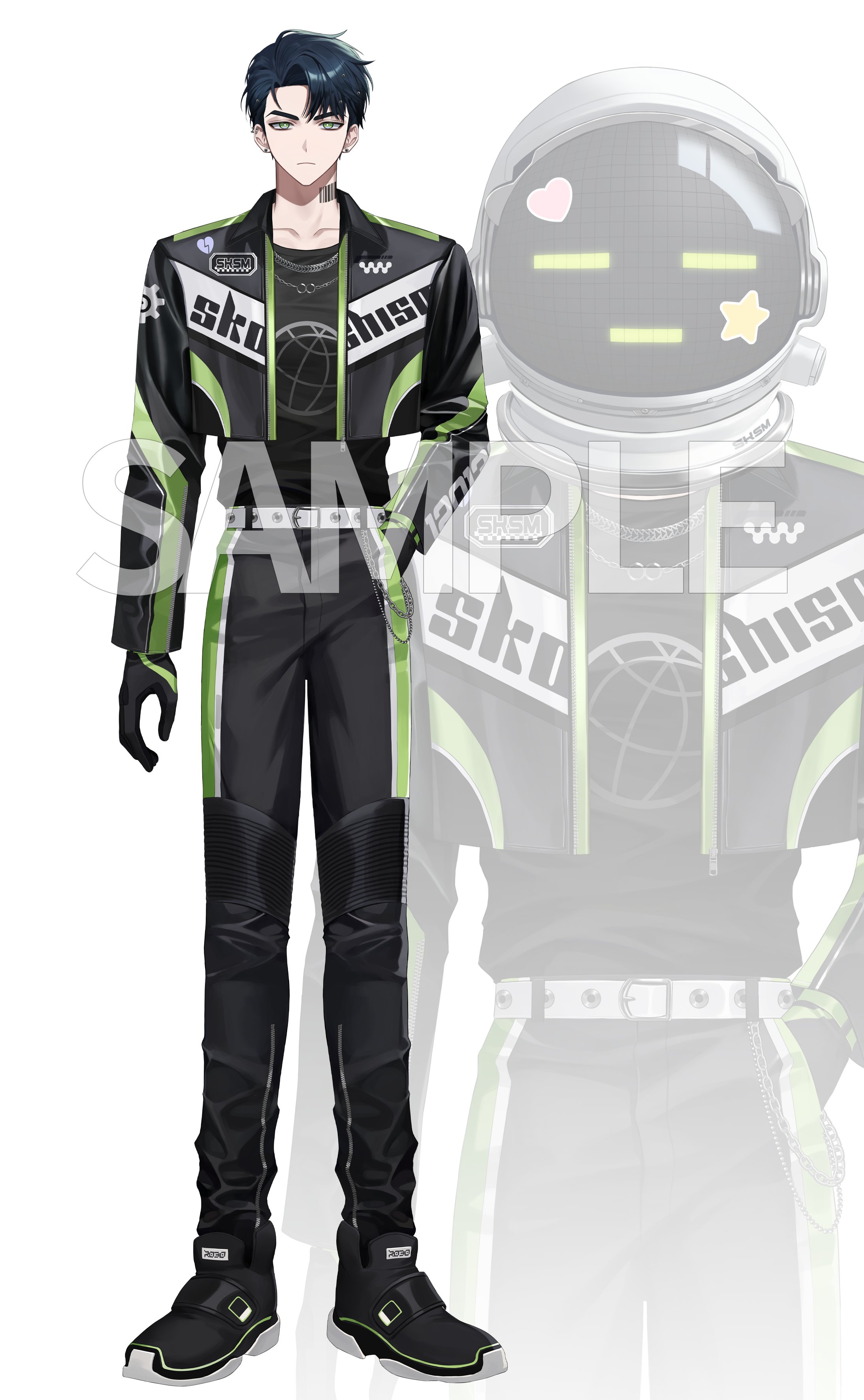 1boy absurdres bags_under_eyes barcode barcode_tattoo belt belt_buckle black_gloves black_hair black_jacket black_pants black_shoes buckle chain chap_yun clothes_writing cropped_jacket earrings full_body gloves green_eyes green_lining heart heart_sticker helmet highres jacket jewelry looking_at_viewer male_focus official_alternate_costume pants racing_suit robo_frostor sample_watermark shoes short_hair simple_background skoshism sneakers space_helmet star_(symbol) star_sticker sticker tachi-e tattoo virtual_youtuber watermark white_background white_belt zoom_layer