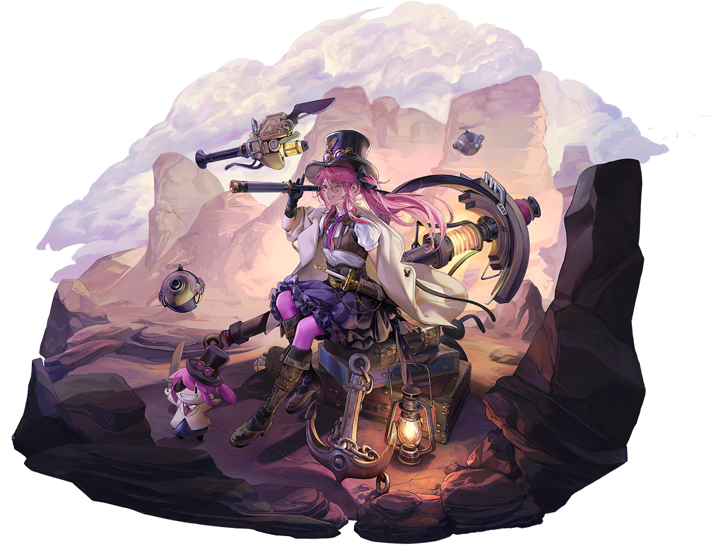 1girl anchor artist_request asymmetrical_gloves black_gloves boots briefcase brown_boots brown_corset chain character_doll corked_bottle corset doll drone eyepatch flat_chest flying glasses gloves goggles goggles_on_headwear hat holding holding_sword holding_telescope holding_weapon jacket knee_boots lantern leggings long_hair looking_through_scope necktie off_shoulder official_art parted_lips path_to_nowhere pink_eyes pink_hair pink_leggings pink_necktie puffy_short_sleeves puffy_sleeves purple_skirt round_eyewear sheath sheathed shirt short_sleeves skirt smile steampunk stuffed_animal stuffed_rabbit stuffed_toy summer_(path_to_nowhere) sword telescope top_hat weapon white_shirt yellow_jacket