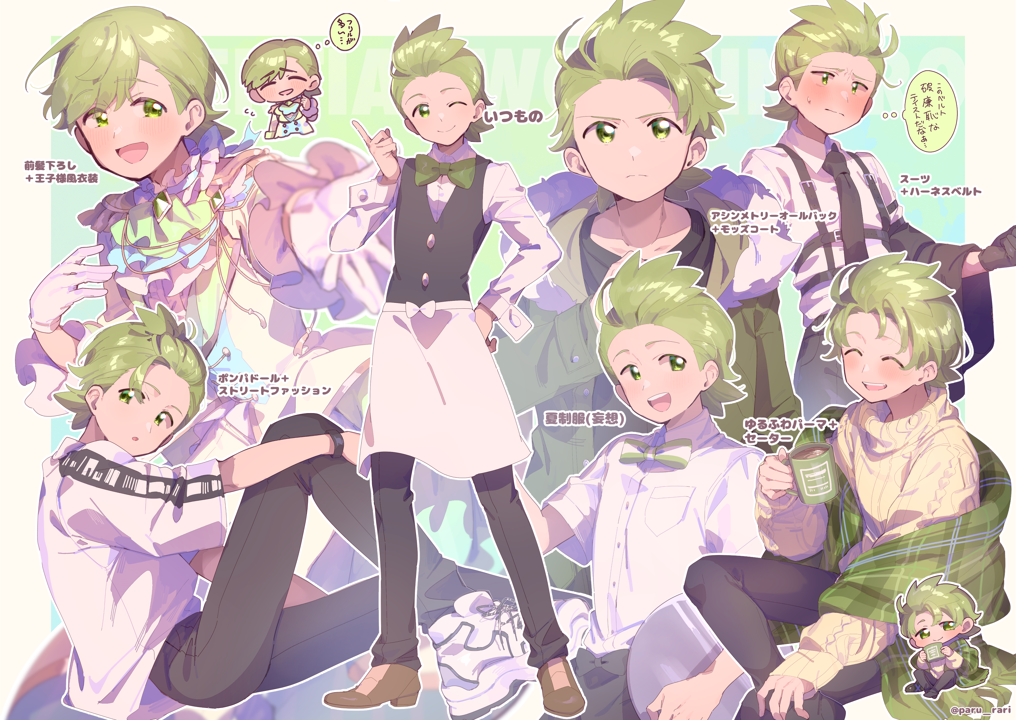 1boy :d :o ^_^ absurdres apron ascot belt black_apron black_belt black_gloves black_pants black_shirt black_socks black_vest blurry blurry_foreground blush border bow bowtie breast_pocket brown_shoes buttons chest_harness chibi cilan_(pokemon) closed_eyes closed_mouth collarbone collared_shirt commentary_request cowboy_shot cropped_legs cup foot_out_of_frame frilled_sleeves frills fur-trimmed_hood fur_trim gloves green_ascot green_background green_bow green_bowtie green_eyes green_hair green_jacket green_scarf grid_background hand_on_own_hip hand_up harness highres holding holding_cup holding_tray hood hood_down hooded_jacket index_finger_raised jacket knee_up long_sleeves looking_at_viewer male_focus mug multiple_views nintendo open_clothes open_jacket open_mouth outline outside_border outstretched_arm pants plaid_clothes plaid_scarf pocket pokemon pokemon_black_and_white ribbed_sweater scarf serizawa_serizane shirt shoes short_hair short_sleeves sitting smile sneakers socks speech_bubble standing striped_bow striped_bowtie striped_clothes sweatdrop sweater teeth thought_bubble translation_request tray turtleneck turtleneck_sweater twitter_username upper_teeth_only vest waist_apron white_apron white_border white_gloves white_jacket white_outline white_pants white_shirt white_shoes yellow_sweater