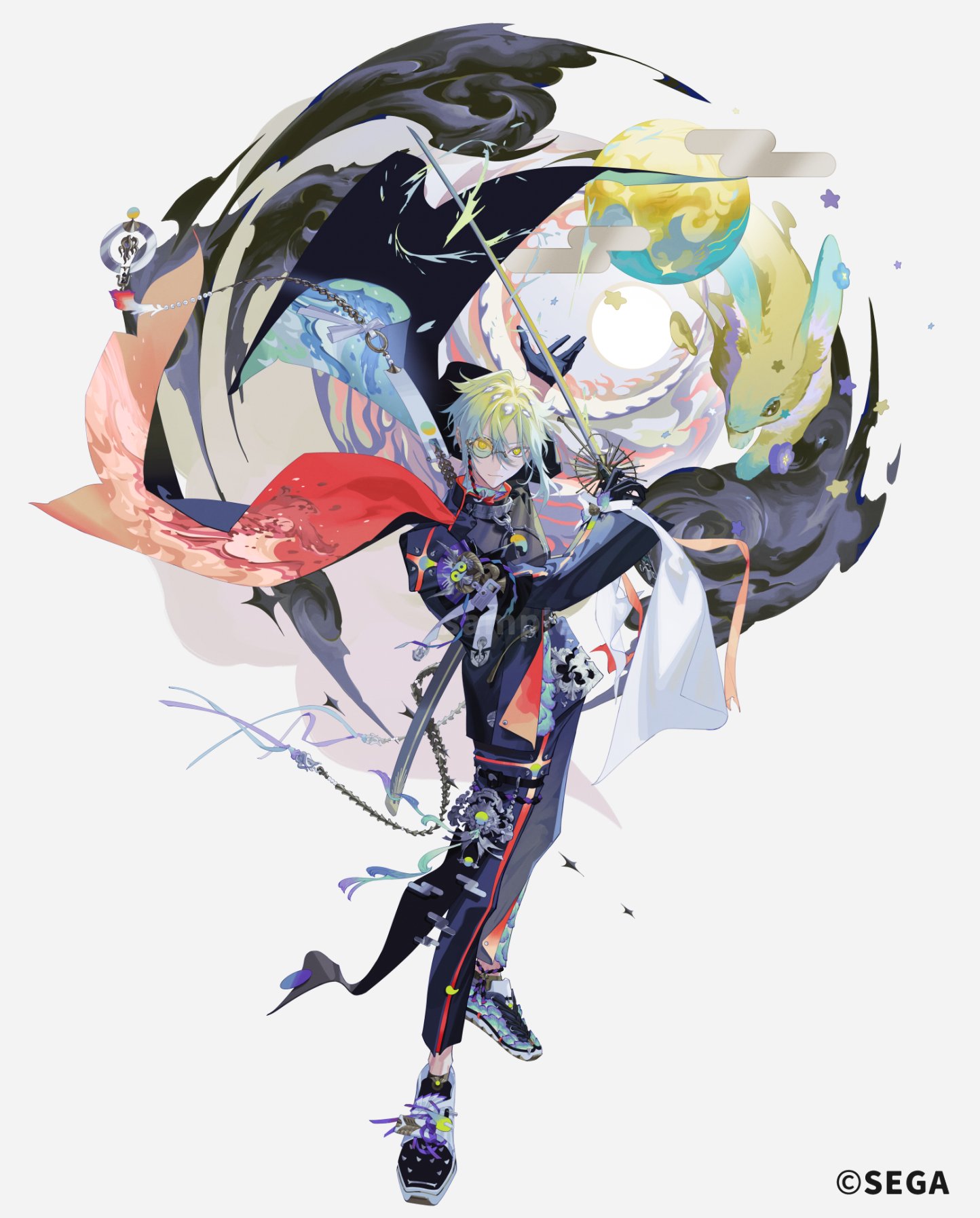 1boy asymmetrical_footwear bell_sleeves black_cape black_gloves black_jacket black_pants black_shoes blue_hair blue_ribbon cape chain charm_(object) closed_mouth collar copyright_notice creature egasumi expressionless flower full_body full_moon gloves gradient_hair green_eyes green_hair hair_between_eyes hand_up high_collar highres holding holding_sword holding_weapon id_card jacket jewelry long_sleeves looking_at_viewer maimai_(game) male_focus molatoliamu monocle moon multicolored_hair official_art pants pendant print_cape print_jacket purple_flower purple_ribbon red_cape ribbon sheath shoes short_hair shoulder_guard sidelocks simple_background smoke sneakers solo standing star_(symbol) sword tassel thigh_strap tinted_eyewear two-sided_cape two-sided_fabric upturned_eyes wave_print weapon white_background white_ribbon yellow-tinted_eyewear yellow_pupils