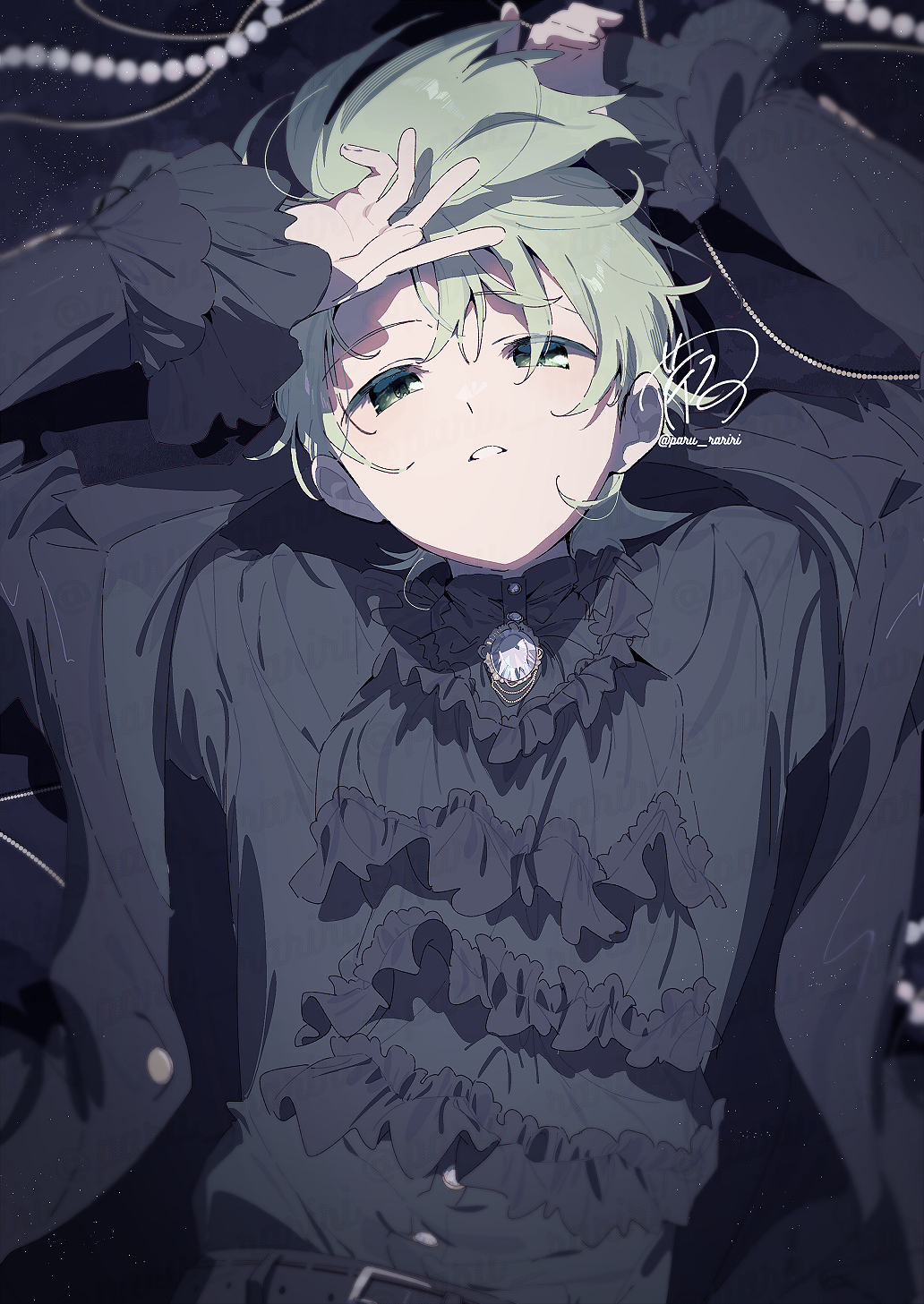 1boy arms_up black_background black_jacket black_shirt brooch cilan_(pokemon) commentary_request green_eyes green_hair highres jacket jewelry long_sleeves looking_at_viewer lying male_focus nintendo on_back open_clothes open_jacket parted_lips pokemon pokemon_black_and_white serizawa_serizane shirt short_hair solo twitter_username upper_body