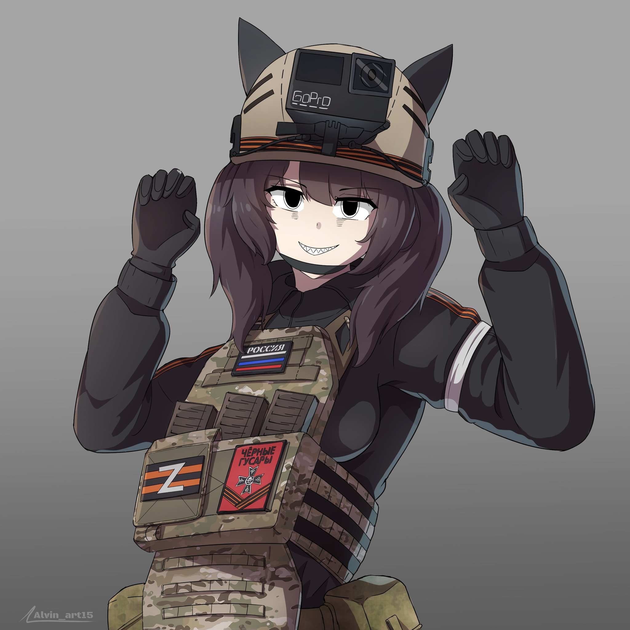 &{ID:13749178 CreatedAt:Sun Mar 29 06:15:20 -0500 2026 Score:0 Width:2048 Height:2047 MD5:41d787ce501e0cc466f0d18d65764ee9 Directory:41/d7 Image:41d787ce501e0cc466f0d18d65764ee9.jpg Rating:general Source:https://x.com/Alvin_art15/status/2037494817815716262 Change:1774782921 Owner:danbooru CreatorID:6498 ParentID:0 Sample:1 PreviewHeight:349 PreviewWidth:350 Tags:1girl action_camera alvin_art15 animal_ears armband black_jacket body_armor brown_hair camera camera_on_headwear cat_ears combat_helmet fake_animal_ears grin helmet highres jacket magazine_(weapon) marusha_(b1-517) military_combat_uniform military_uniform morale_patch original patch ribbon_of_saint_george russian_flag russian_ground_forces russo-ukrainian_war sharp_teeth smile solo teeth twintails video_camera white_armband z_(russian_symbol) Title: HasNotes:false HasComments:false FileURL:https://img2.gelbooru.com/images/41/d7/41d787ce501e0cc466f0d18d65764ee9.jpg PreviewURL:https://gelbooru.com/thumbnails/41/d7/thumbnail_41d787ce501e0cc466f0d18d65764ee9.jpg SampleURL:https://img2.gelbooru.com/samples/41/d7/sample_41d787ce501e0cc466f0d18d65764ee9.jpg SampleHeight:850 SampleWidth:850 Status:active PostLocked:0 HasChildren:false IsVideo:false DisplayDate:29.03.2026 06:15}