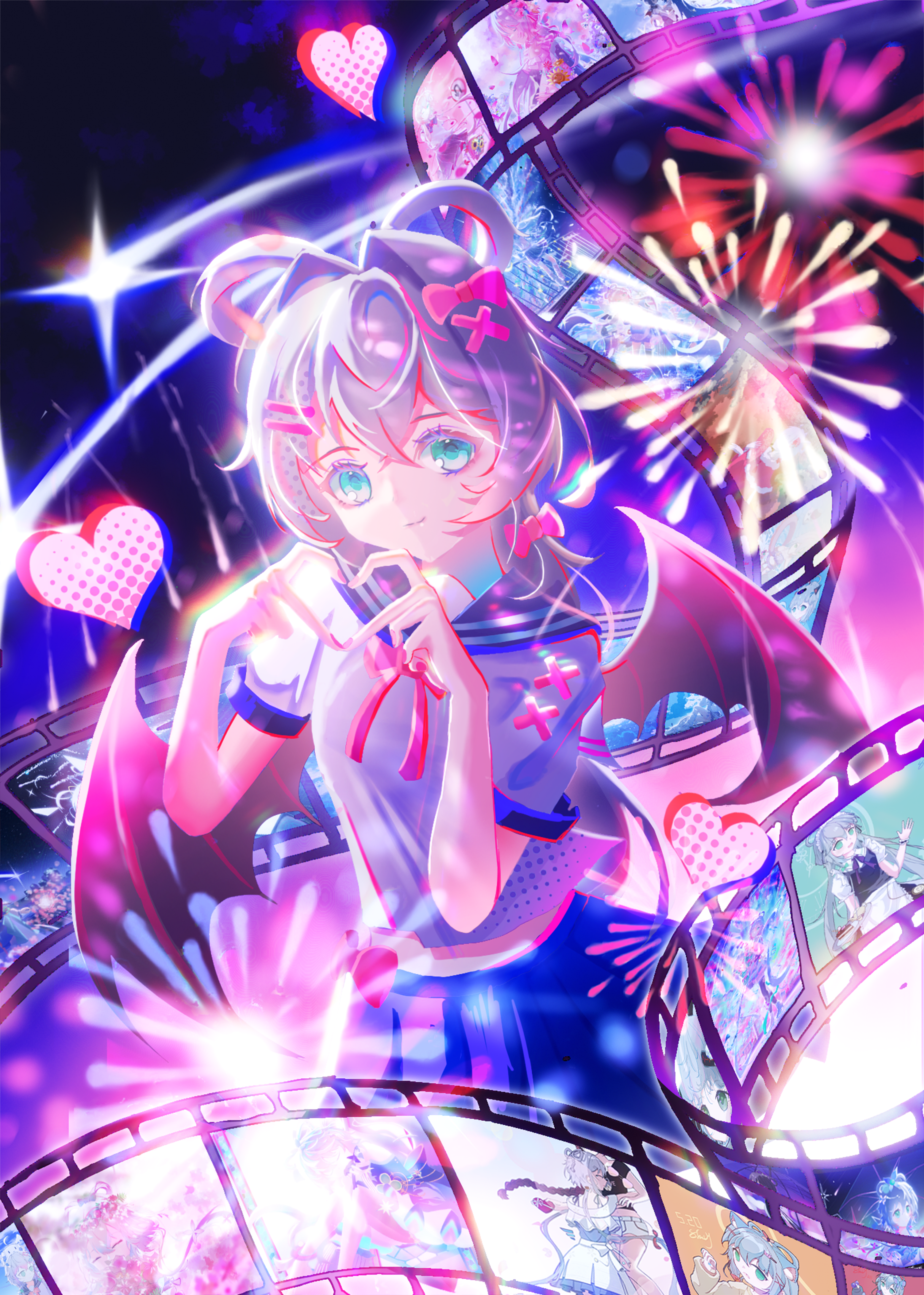 1girl absurdres blue_skirt bow closed_mouth demon_wings feixianji_(hairstyle) film_strip fireworks green_eyes grey_hair hair_rings heart heart_hands highres looking_at_viewer luo_tianyi pink_bow school_uniform serafuku shirt skirt skuyxiao smile solo vocaloid vsinger_(vocaloid) white_shirt wings