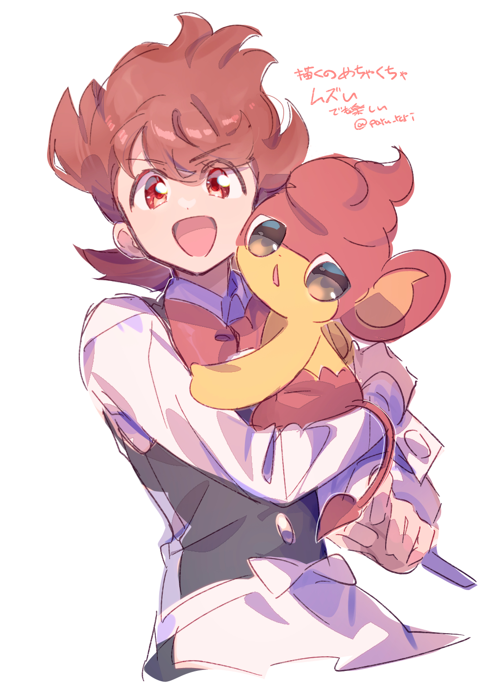 1boy :d apron black_vest bow bowtie brown_eyes buttons chili_(pokemon) collared_shirt commentary_request cropped_torso gen_5_pokemon highres holding holding_pokemon long_sleeves looking_at_viewer male_focus nintendo open_mouth pansear pokemon pokemon_(creature) pokemon_black_and_white red_bow red_bowtie red_eyes red_hair serizawa_serizane shirt short_hair simple_background smile translation_request twitter_username v-shaped_eyebrows vest waist_apron white_apron white_background white_shirt