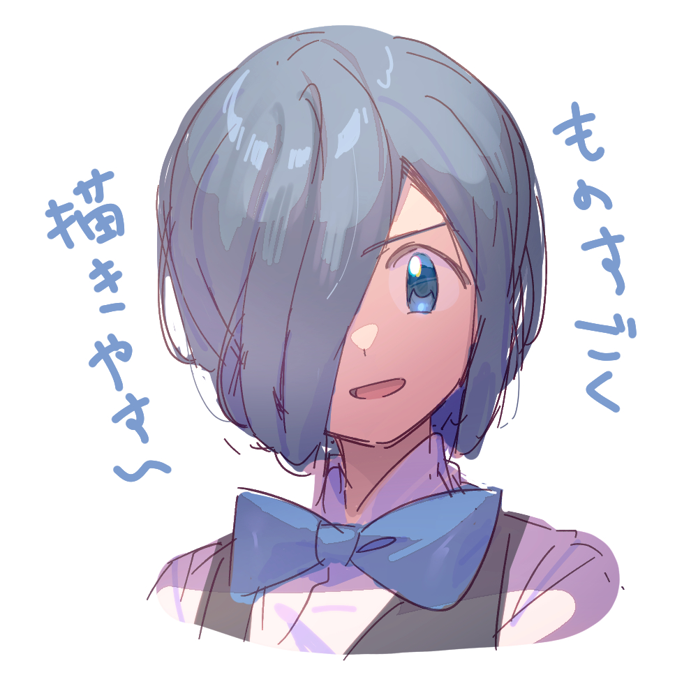 1boy :d black_vest blue_bow blue_bowtie blue_eyes blue_hair bow bowtie collared_shirt commentary_request cress_(pokemon) cropped_shoulders hair_over_one_eye looking_at_viewer male_focus nintendo open_mouth pokemon pokemon_black_and_white serizawa_serizane shirt short_hair simple_background sketch smile solo translation_request vest white_background white_shirt