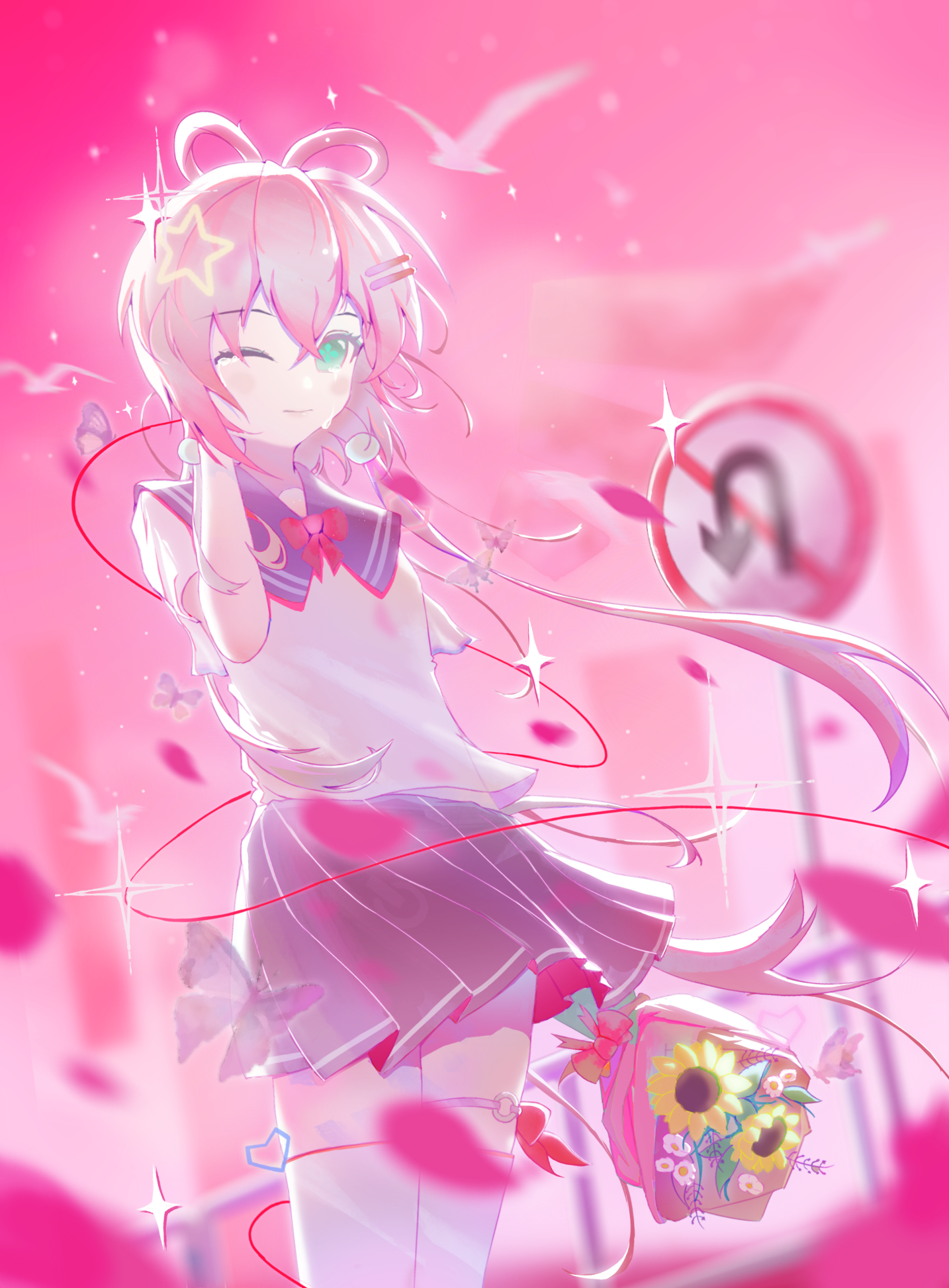 1girl bird bouquet closed_mouth crying crying_with_eyes_open feixianji_(hairstyle) flower green_eyes grey_hair hair_rings hand_on_own_face highres holding holding_bouquet long_hair looking_at_viewer luo_tianyi one_eye_closed pink_sky road_sign school_uniform serafuku short_hair_with_long_locks sign skirt skuyxiao sky smile socks solo tears thighhighs vocaloid vsinger_(vocaloid) white_socks zettai_ryouiki