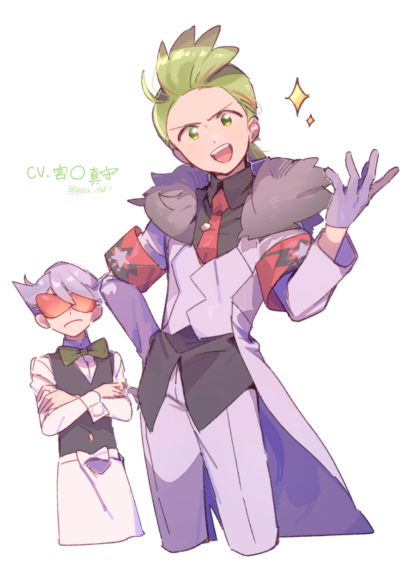 2boys armband black_shirt cilan_(pokemon) cilan_(pokemon)_(cosplay) closed_mouth coat collared_shirt commentary_request cosplay costume_switch cropped_legs crossed_arms fur_collar goggles green_eyes green_hair grey_coat grey_pants lear_(pokemon) lear_(pokemon)_(cosplay) long_sleeves looking_at_viewer male_focus multiple_boys necktie nintendo open_clothes open_coat open_mouth pants pokemon pokemon_black_and_white pokemon_masters_ex purple_hair red_armband red_necktie serizawa_serizane shirt short_hair simple_background sparkle standing teeth translation_request twitter_username upper_teeth_only v-shaped_eyebrows white_background
