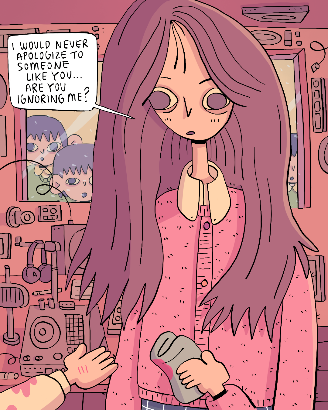 1girl 2boys all_of_us_are_dead flat_color hetero highres kajiuna large_ears lee_na-yeon long_hair multiple_boys napkin neck netflix open_hand pink_sweater school school_uniform speech_bubble sweater toon_(style)