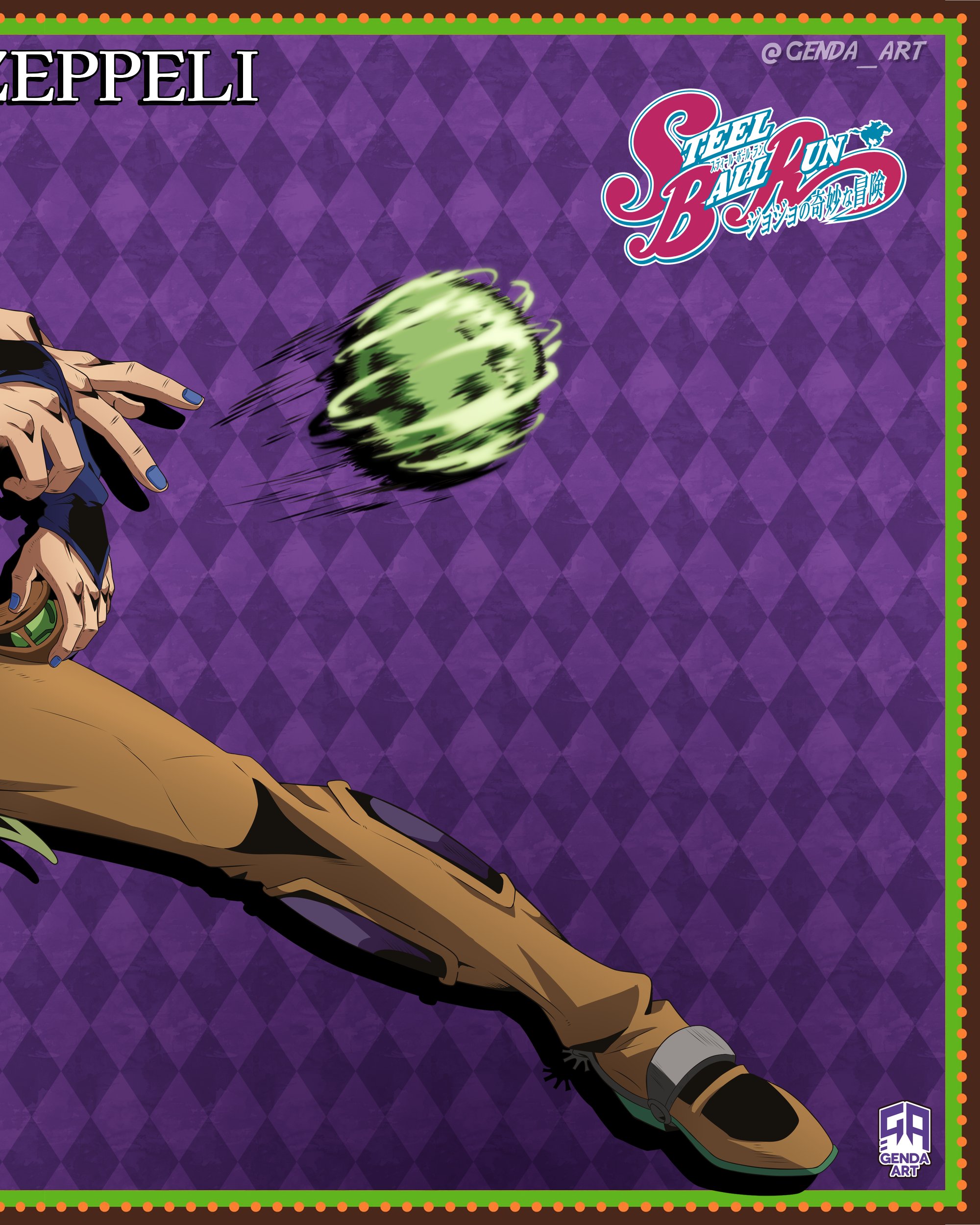 1boy absurdres anime_coloring argyle_background blue_bridal_gauntlets blue_nails bridal_gauntlets brown_pants colored_shoe_soles commentary english_commentary genda_art gyro_zeppeli highres holster jojo_no_kimyou_na_bouken leg_focus logo official_style pants purple_background solo spinning spurs steel_ball_(jojo) steel_ball_run