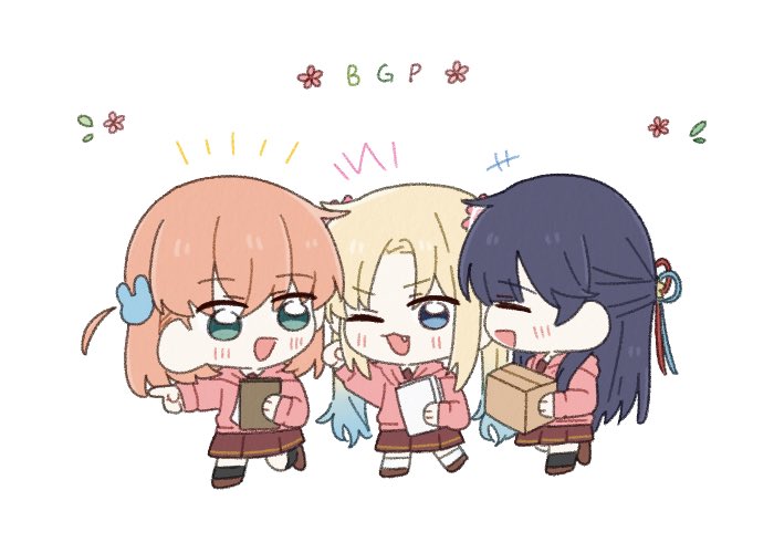 3girls ;3 ;d black_socks blonde_hair bloom_garden_party_jacket blue_eyes blue_hair brown_dress chibi chibi_only closed_eyes commentary dress fang flower gradient_hair hair_flower hair_ornament hasu_no_sanrenka hasu_no_sora_school_uniform hinoshita_kaho jacket link!_like!_love_live! long_hair love_live! medium_dress medium_hair multicolored_hair multiple_girls murano_sayaka one_eye_closed open_mouth orange_hair osawa_rurino pink_flower pink_jacket pleated_dress pointing rabbit_hair_ornament sailor_collar sailor_dress school_uniform simple_background smile socks two_side_up untranslatable_commentary virtual_youtuber walking white_background white_sailor_collar white_socks winter_uniform zueka27