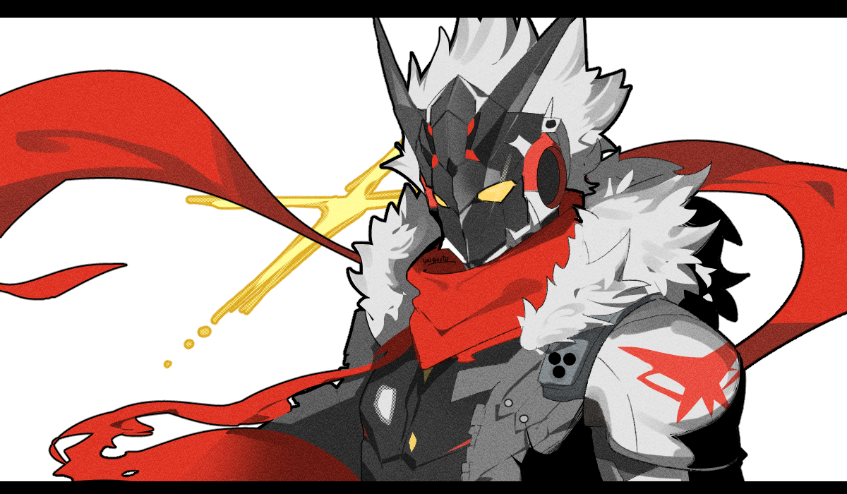 1boy ai_manato billy_kid billy_kid_(starlight) black_jacket clothed_robot commentary_request floating_scarf fur-trimmed_jacket fur_trim horns humanoid_robot jacket letterboxed male_focus red_scarf robot robot_boy scarf simple_background solo sparkle spiked_hair torn_clothes torn_scarf upper_body white_background white_hair yellow_eyes zenless_zone_zero