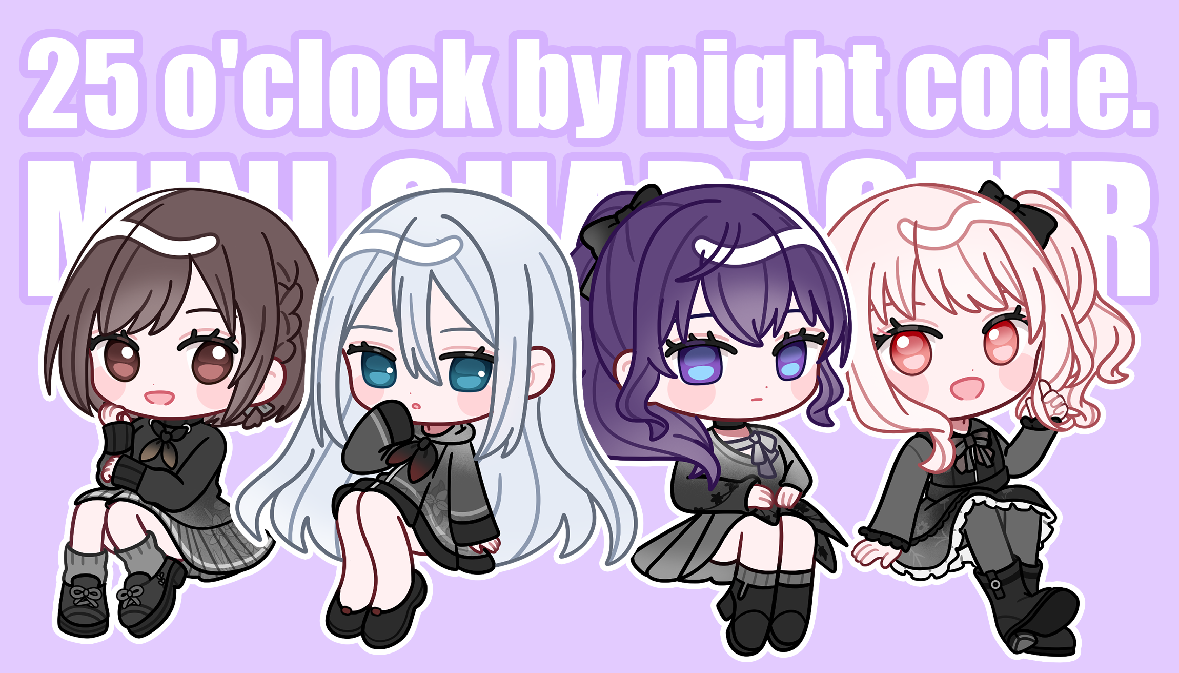 1other 25-ji_nightcord_de._(project_sekai) 3girls :d akiyama_mizuki asahina_mafuyu black_boots black_bow black_bowtie black_choker black_dress black_neckerchief black_shoes blue_eyes blush_stickers boots botausaa bow bowtie braid brown_eyes brown_hair chibi chibi_only choker closed_mouth commentary_request dot_nose double-parted_bangs dress frilled_dress frills full_body grey_hair grey_pantyhose grey_socks hair_between_eyes hair_bow hand_up highres long_hair long_sleeves looking_at_viewer multiple_girls neckerchief open_mouth other_focus outline pantyhose pink_eyes pink_hair ponytail project_sekai purple_background purple_eyes purple_hair ribbed_socks shinonome_ena shoes short_hair side_ponytail sidelocks simple_background sitting sleeves_past_wrists smile socks very_long_hair white_outline yoisaki_kanade