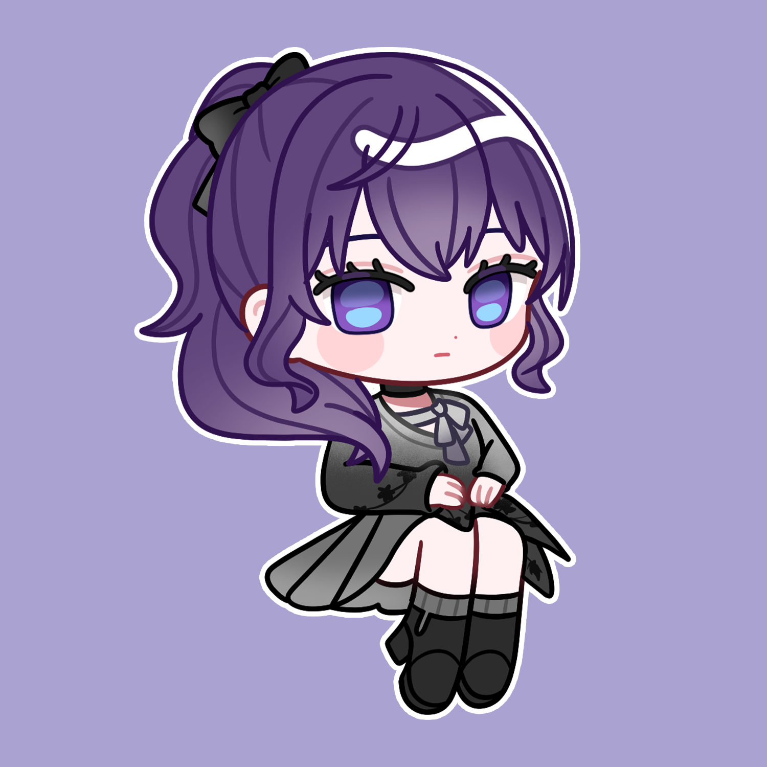 1girl asahina_mafuyu black_boots black_bow black_choker black_dress blush_stickers boots botausaa bow chibi chibi_only choker closed_mouth commentary_request dot_nose dress full_body grey_socks hair_bow highres long_hair long_sleeves looking_at_viewer outline ponytail project_sekai purple_background purple_eyes purple_hair ribbed_socks simple_background socks solo white_outline