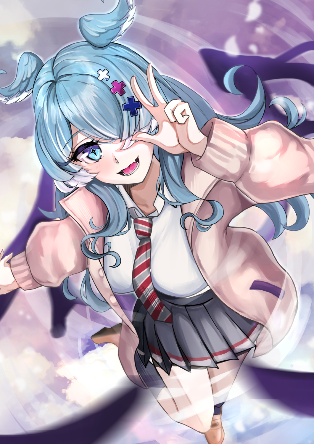 1girl black_skirt black_socks blue_eyes blue_hair breasts brown_jacket brown_shoes d_gokoko elira_pendora from_above full_body hair_over_one_eye head_wings highres jacket large_breasts long_hair looking_at_viewer miniskirt necktie nijisanji nijisanji_en one_eye_covered open_mouth pleated_skirt shirt shirt_tucked_in shoes skirt smile socks solo standing standing_on_one_leg striped_clothes striped_necktie v virtual_youtuber white_shirt wings