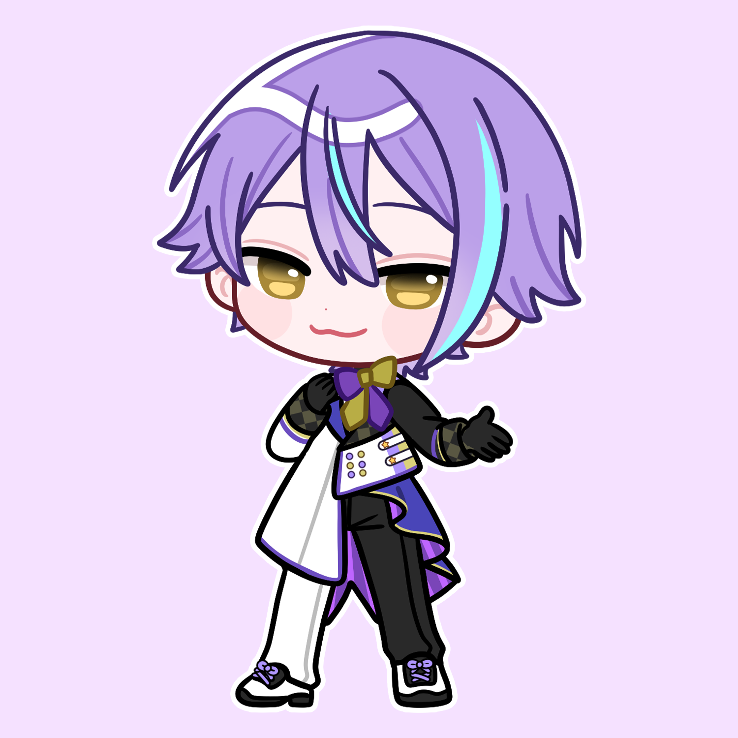 1boy :3 black_gloves black_pants blue_streaks blush_stickers botausaa bow bowtie checkered_sleeves chibi chibi_only closed_mouth coat commentary_request dot_nose double-parted_bangs full_body gloves hair_between_eyes highres kamishiro_rui long_sleeves looking_at_viewer male_focus multicolored_hair outline pants project_sekai purple_background purple_bow purple_bowtie purple_hair short_hair simple_background smile solo standing streaked_hair two-tone_bow two-tone_bowtie two-tone_pants white_coat white_outline white_pants yellow_bow yellow_bowtie yellow_eyes