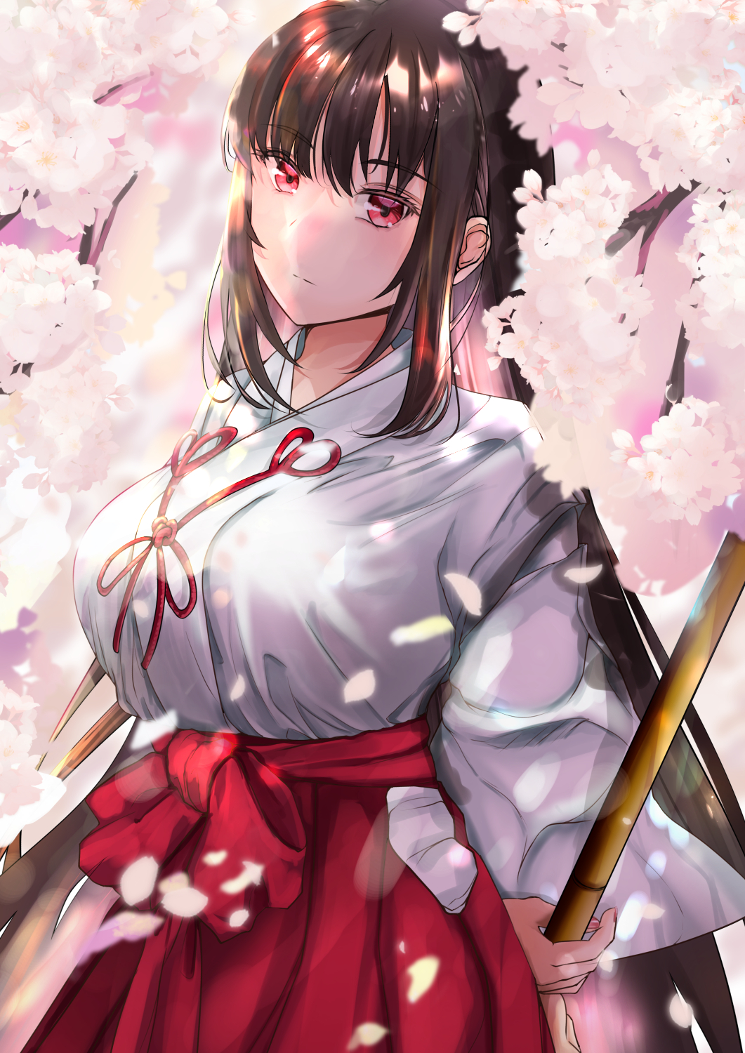 1girl breasts broom cherry_blossoms closed_mouth cowboy_shot d_gokoko highres holding holding_broom japanese_clothes large_breasts long_hair long_sleeves looking_at_viewer miko original outdoors pink_background red_eyes red_skirt shirt shirt_tucked_in sidelocks skirt solo very_long_hair white_shirt