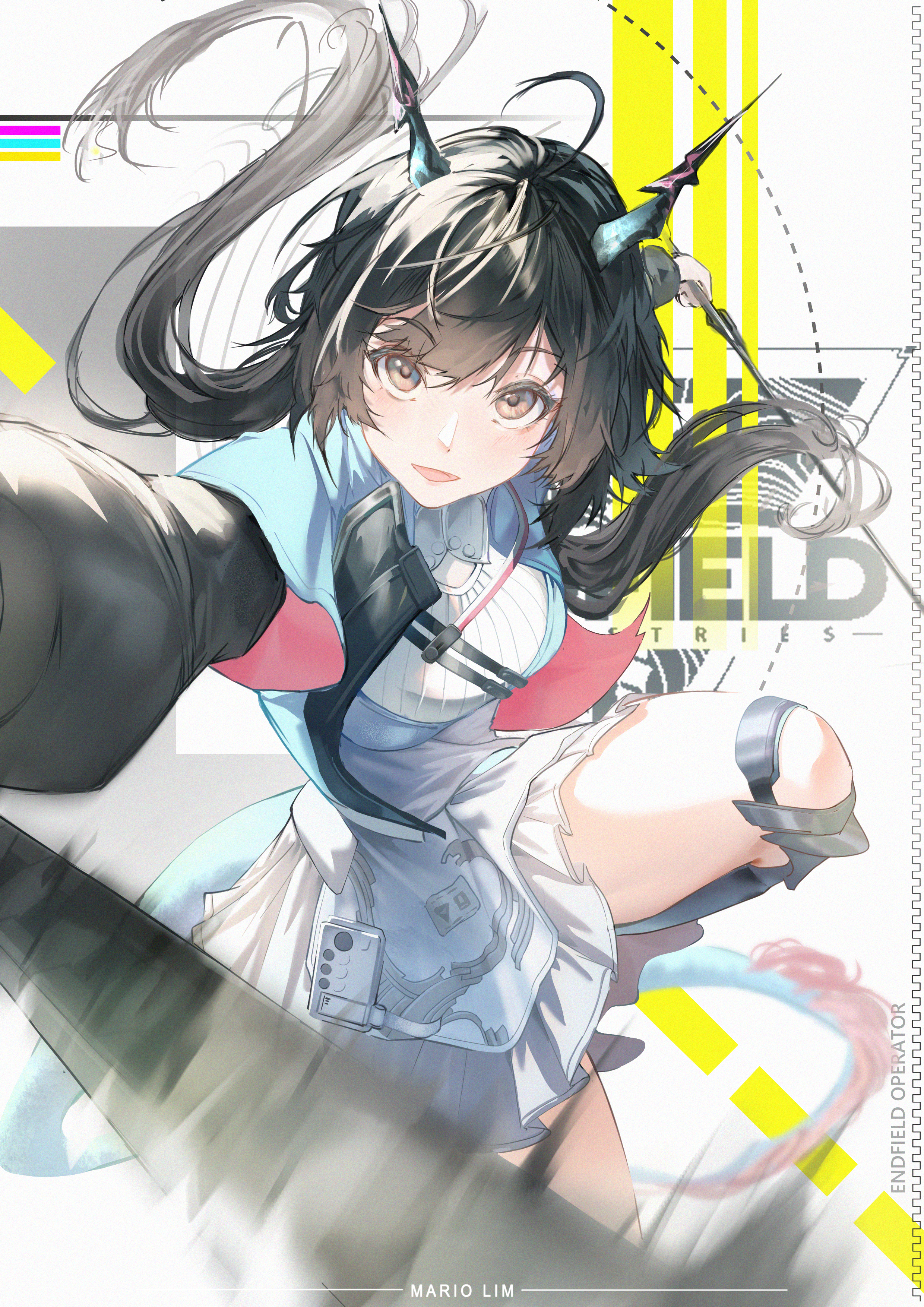 1girl absurdres arknights arknights:_endfield black_hair blue_horns blue_jacket blue_tail chen_qianyu_(arknights) dragon_girl dragon_horns dragon_tail eastern_dragon_horns eastern_dragon_tail highres horns jacket long_hair looking_at_viewer low_twintails open_clothes open_mouth solo tail twintails xiaoxjie