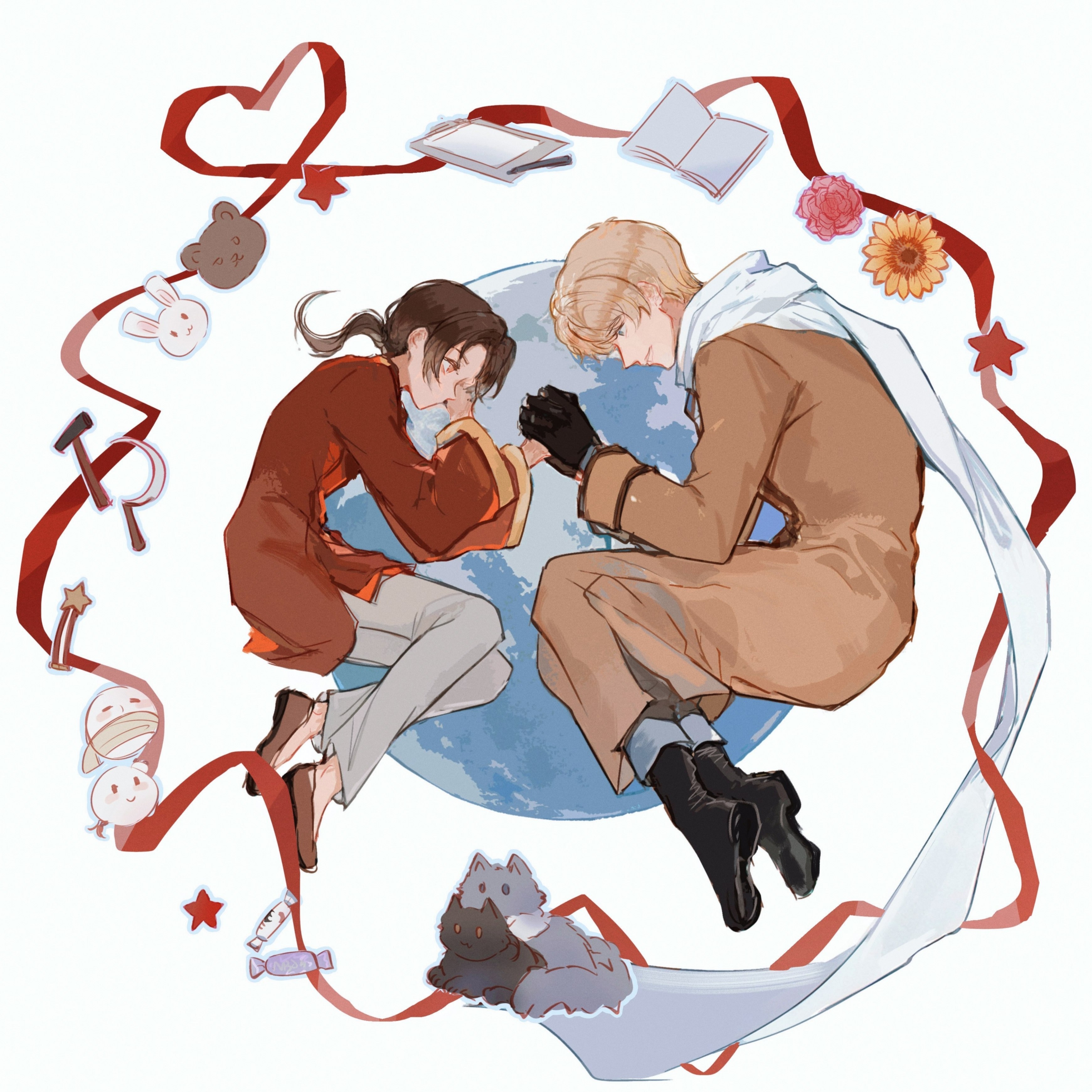 2boys absurdres animal animal_ears animalization axis_powers_hetalia baggy_pants black_boots black_fur black_gloves blonde_hair book boots brown_coat brown_hair brown_pants brown_shoes candy cat cat_ears cat_tail changpao china_(hetalia) chinese_clothes chinese_commentary clipboard closed_mouth coat commentary_request earth_(planet) flower food full_body gloves grey_fur grey_pants hair_between_eyes hammer_and_sickle hands_up heart heart_of_string highres holding_hands junzi657 long_hair long_sleeves looking_at_another lotus low_ponytail lying male_focus medal multiple_boys on_side open_book orange_eyes pants pen person_and_animalization pink_flower planet ponytail purple_eyes red_changpao red_shirt russia_(hetalia) scarf shirt shoes short_hair sidelocks smile star_(symbol) star_ornament stuffed_animal stuffed_rabbit stuffed_toy sunflower tail tape teddy_bear white_background white_scarf wide_sleeves yaoi yellow_flower