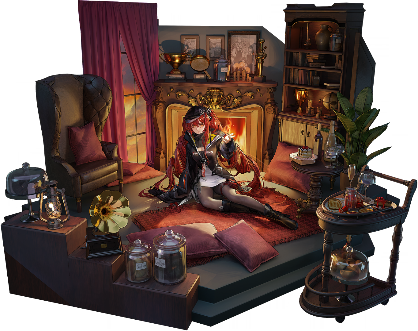 1girl alcohol artist_request beckoning black_hat black_jacket black_pantyhose black_shoes black_sweater book bookshelf bottle bread bread_slice breasts butter_knife cake chair cleavage cookie_jar cup curtains drill_hair drinking_glass fireplace food food_stand fruit glass_dome glass_jar globe hat ignis_(path_to_nowhere) indoors jacket knife lantern long_hair looking_at_viewer medium_breasts newsboy_cap official_art orange_eyes pantyhose path_to_nowhere phonograph pillow plate pouch pushcart red_hair ribbed_sweater rug serving_dome shirt shoes strawberry sweater table thigh_pouch thigh_strap toast trophy turtleneck turtleneck_sweater unzipped white_shirt window wine wine_bottle wine_glass zipper zipper_pull_tab