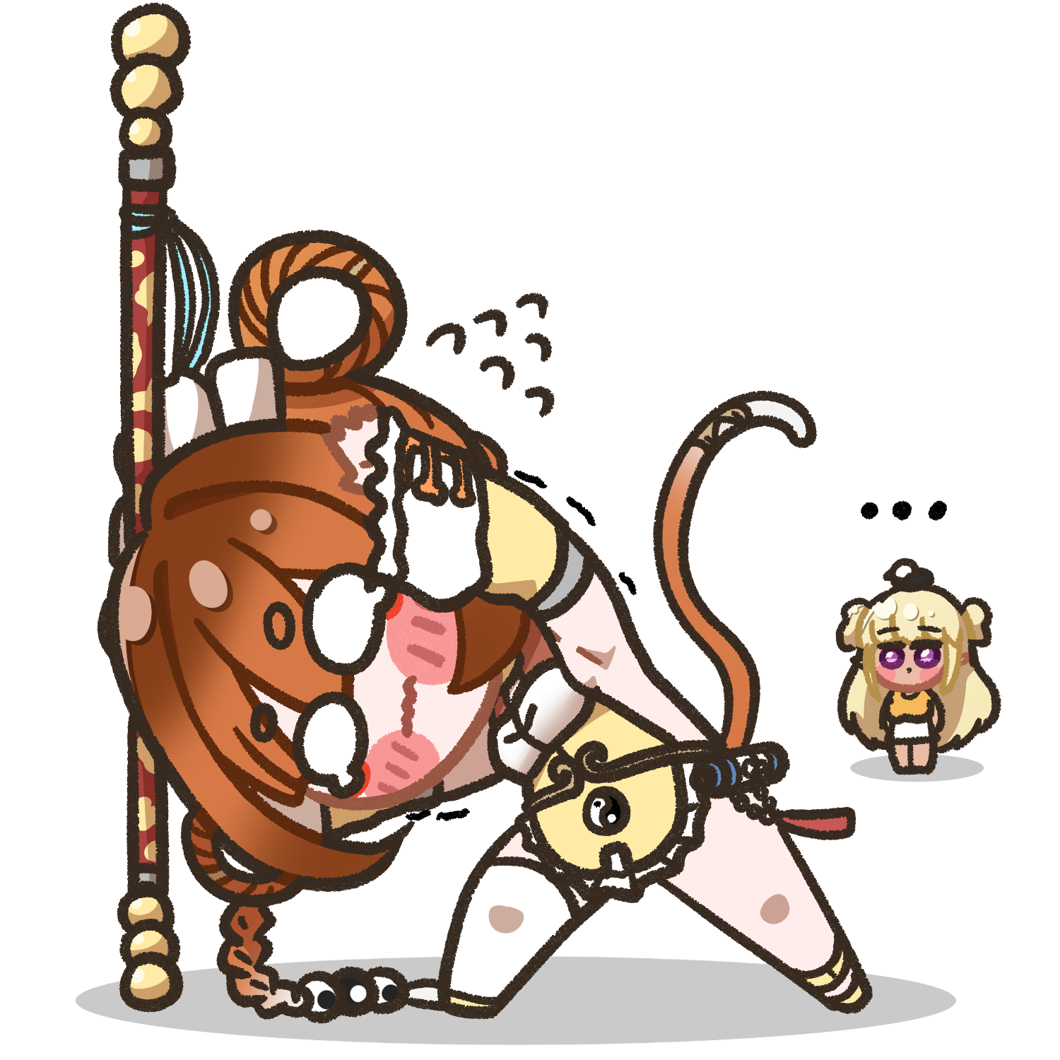 ... 2girls alternate_costume apron armpits asymmetrical_legwear bird black_apron blonde_hair blush_stickers bo_staff braid braided_hair_rings braided_ponytail breasts brown_hair chibi chibi_only clooliss commentary_request dark-skinned_female dark_elf dark_elven_forest_ranger dark_skin detached_sleeves eagle elf hair_rings highres kiki_peiling_(last_origin) korean_commentary large_breasts last_origin long_hair monkey_girl monkey_tail multiple_girls pointy_ears purple_eyes reaching tail thick_eyebrows thighhighs two_side_up very_long_hair wavy_mouth white_background white_thighhighs yin_yang