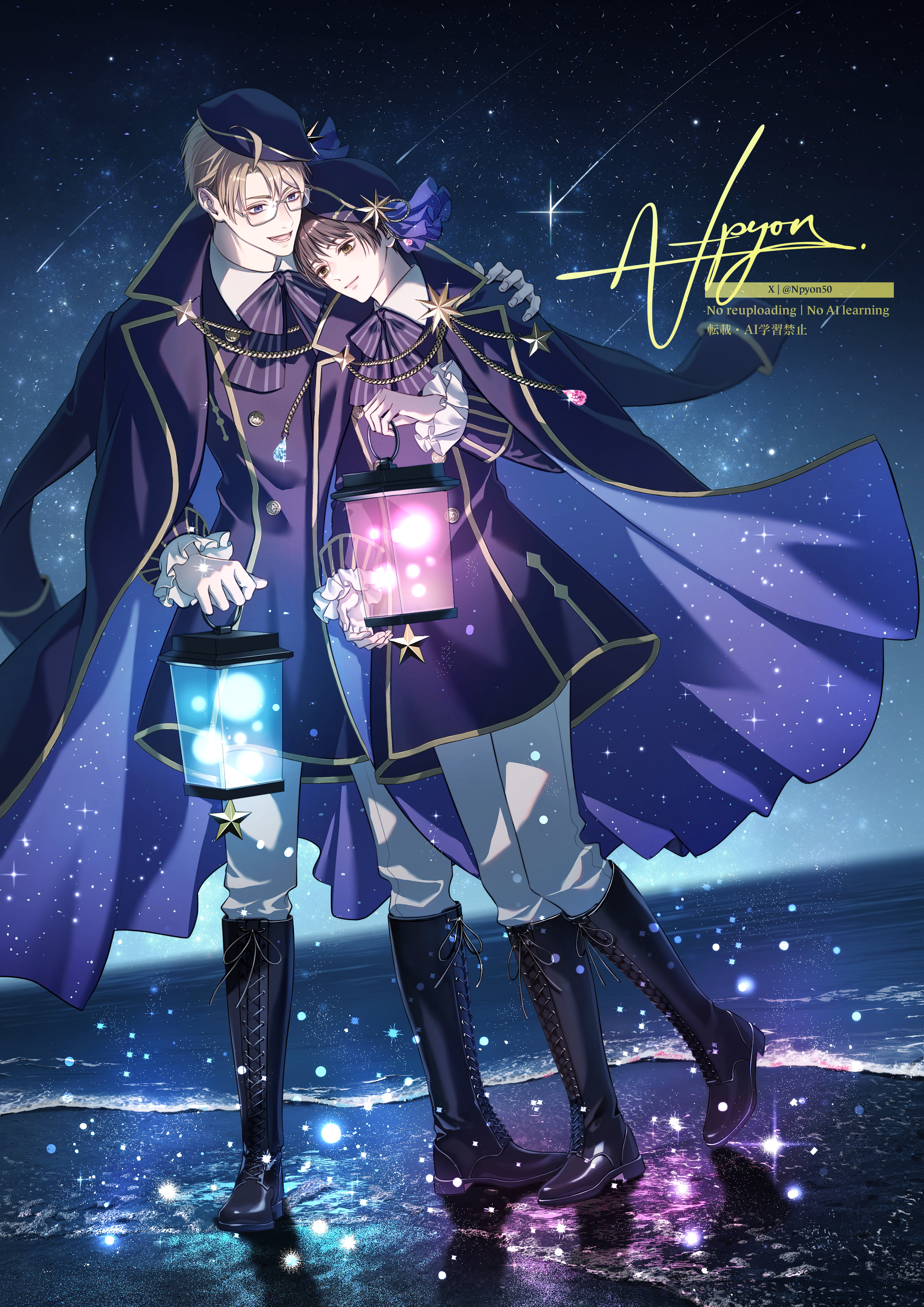 2boys absurdres ahoge america_(hetalia) artist_name axis_powers_hetalia beach beret black_boots black_sky blonde_hair blue_eyes blue_hat blue_jacket blue_sky blush boots bow bowtie brown_eyes brown_hair buttons chain closed_mouth coat collared_shirt commentary_request fingernails floating_clothes frills full_body gem glasses gold_chain gold_trim gradient_sky grey-framed_eyewear hair_between_eyes hand_on_another's_shoulder hand_up hands_up hat hat_ornament highres holding holding_lantern jacket japan_(hetalia) lantern lips long_sleeves looking_at_another male_focus multiple_boys night npyon ocean open_clothes open_coat open_mouth outdoors pants parted_bangs pink_gem puffy_long_sleeves puffy_sleeves purple_bow purple_bowtie purple_coat purple_jacket purple_veil reflection reflective_liquid sand semi-rimless_eyewear shirt shooting_star short_hair sky smile standing star_(sky) star_(symbol) star_hat_ornament star_ornament starry_sky striped_bow teeth tongue two-sided_fabric two-sided_jacket veil watermark white_pants white_shirt yaoi