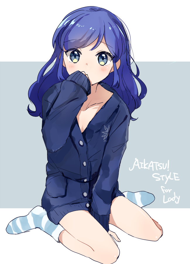 1girl aikatsu! aikatsu!_(series) between_legs blue_cardigan blue_eyes blue_hair blue_socks cardigan commentary_request copyright_name full_body hair_down hand_between_legs hand_to_own_mouth hand_up kiriya_aoi long_hair long_sleeves looking_at_viewer onbin_ha pajamas sitting sleeves_past_wrists socks solo striped_clothes striped_socks wariza