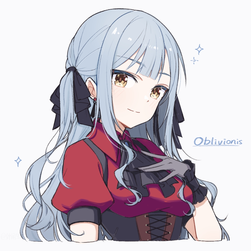 1girl ascot bang_dream! bang_dream!_it's_mygo!!!!! black_ascot black_corset black_ribbon blue_hair breasts character_name chinese_commentary closed_mouth commentary_request corset gloves grey_gloves hair_ribbon long_hair medium_breasts oblivionis_(bang_dream!) red_shirt ribbon shirt short_sleeves sidelocks solo sparkle togawa_sakiko two_side_up upper_body yellow_eyes zhong_xiansheng