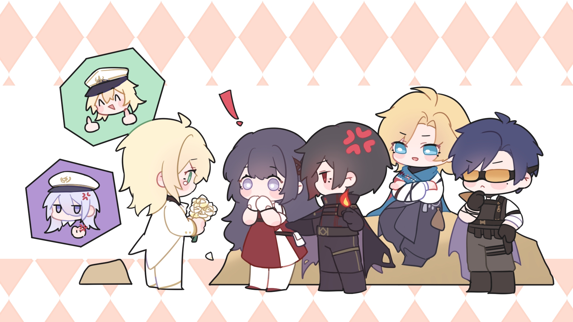 ! 1girl 6+boys :< :d ^_^ alkaid_mcgrath alkaid_mcgrath_(eden) alkaid_mcgrath_(infinite_empire) anger_vein angry argyle_background ascot ayn_alwyn ayn_alwyn_(eden) belt black_belt black_boots black_cloak black_gloves black_hair black_jacket black_pants black_vest blonde_hair blue_cloak blue_eyes blue_hair boots bouquet bulletproof_vest cael_anselm cael_anselm_(infinite_empire) cape center-flap_bangs chinese_commentary clarence_clayden clarence_clayden_(eden) clenched_hand cloak closed_eyes closed_mouth collared_shirt commentary_request covering_own_mouth crying crying_with_eyes_open curtained_hair deformed double_middle_finger dress dual_persona fire flower formal_clothes full_body glasses gloves green_eyes grey_pants hair_between_eyes hand_on_own_chin hat heroine_(lovebrush_chronicles) highres holding holding_bouquet jacket lars_rorschach lars_rorschach_(eden) long_hair long_hair_between_eyes long_sleeves looking_at_another lovebrush_chronicles medium_hair middle_finger military_hat mole mole_under_eye multiple_boys on_rock opaque_glasses open_mouth orange_background outstretched_arm pants pantyhose parted_bangs peaked_cap pouch profile purple_cape purple_eyes pyrokinesis red_dress red_eyes red_shoes rose safety_glasses shirt shoes short_hair side_cape sitting smile speech_bubble spoken_character standing suit tears thigh_pouch vest white_ascot white_background white_flower white_gloves white_hair white_hat white_jacket white_pantyhose white_rose white_shirt white_suit xiuxiuxiujiu